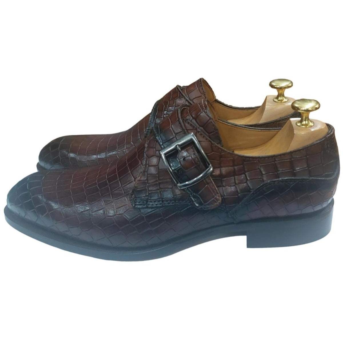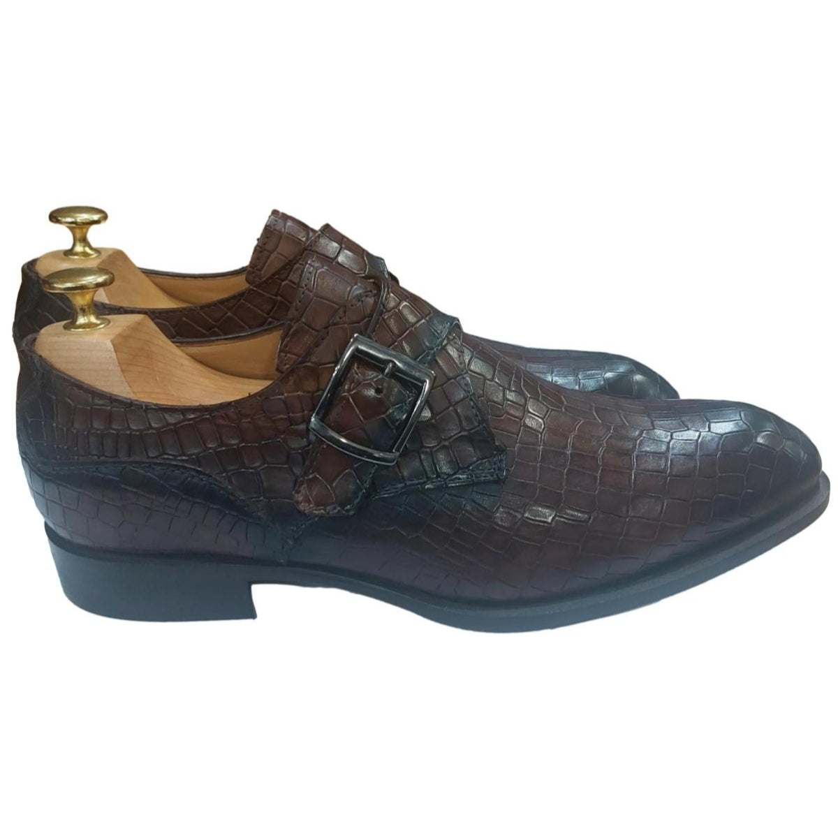 La chaussure derby Laredo en cuir de veau pleine fleur marron foncé, façon croco, allie élégance et robustesse.