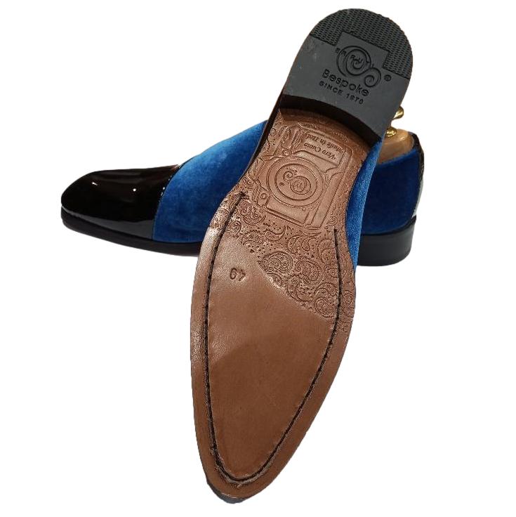 - Dessus bi-matière cuir noir verni et velours bleu avec lacets latéraux