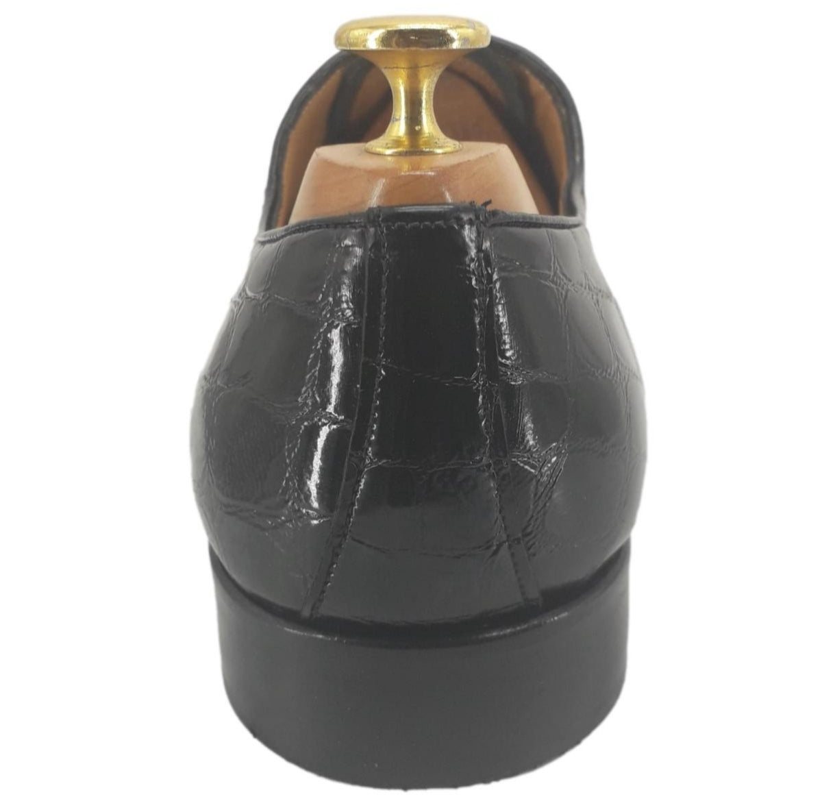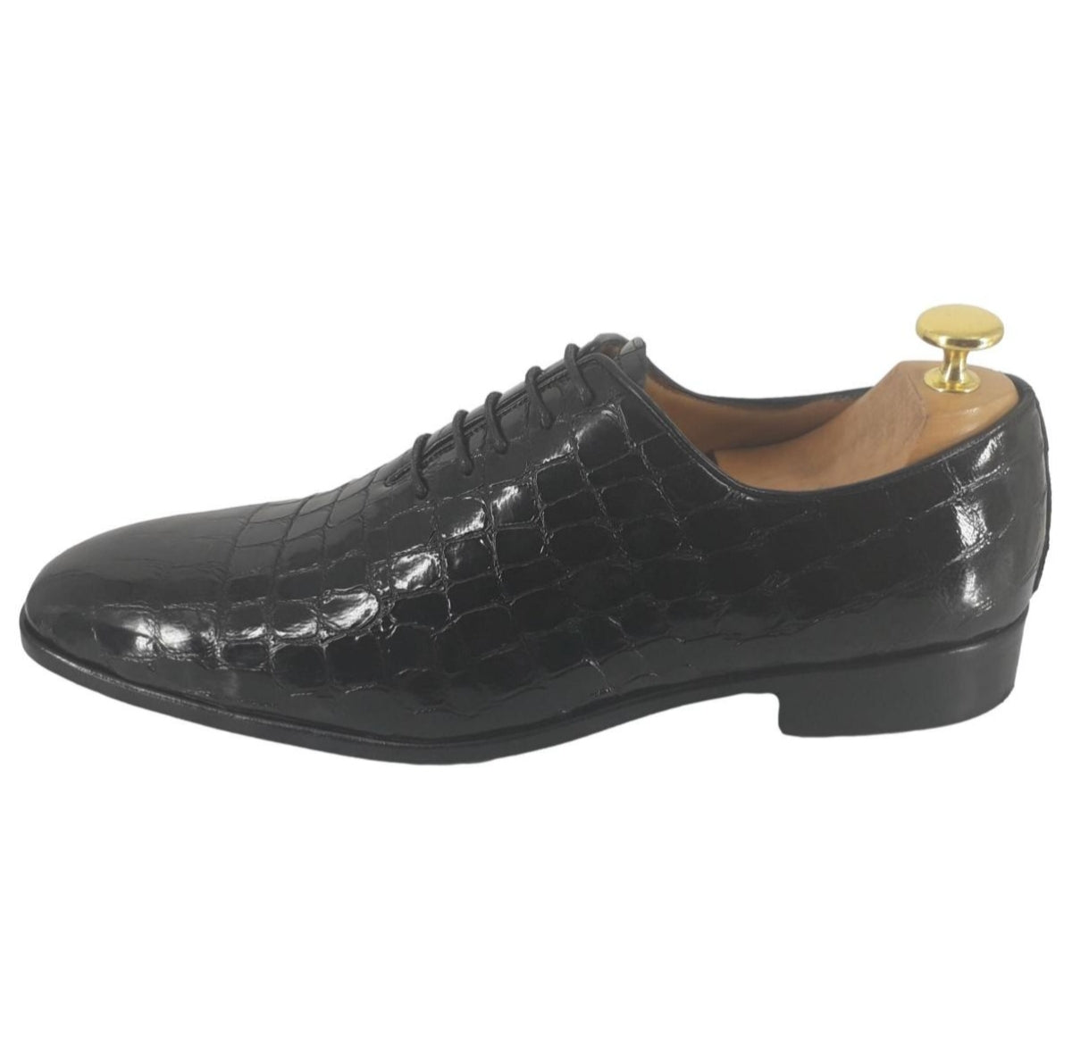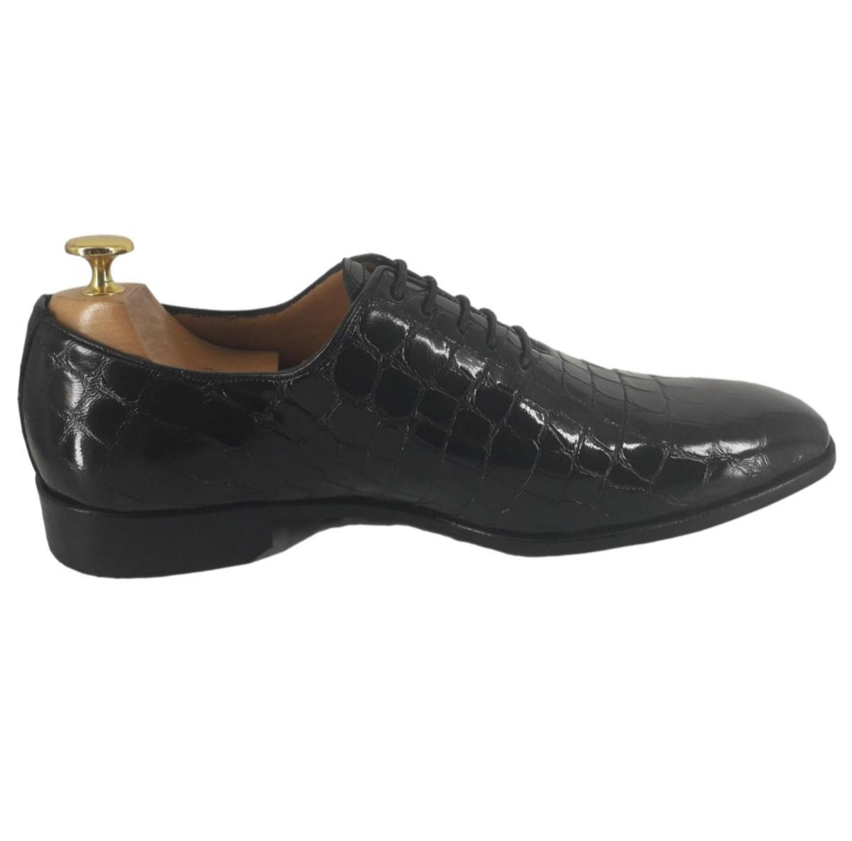 La chaussure Richelieu Cesare allie élégance et originalité grâce à son cuir de veau pleine fleur façon croco verni noir.