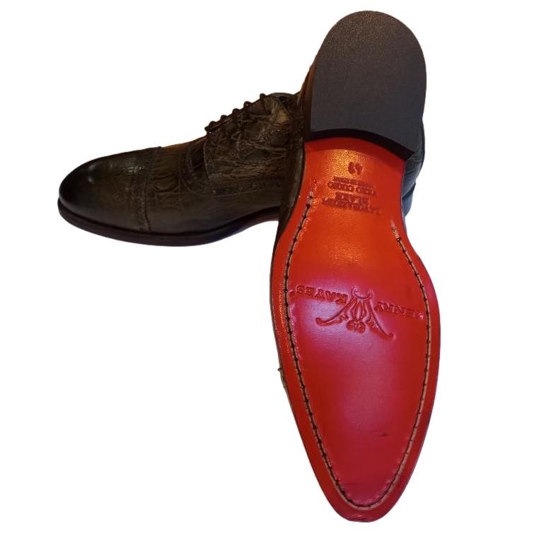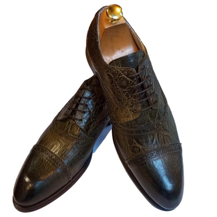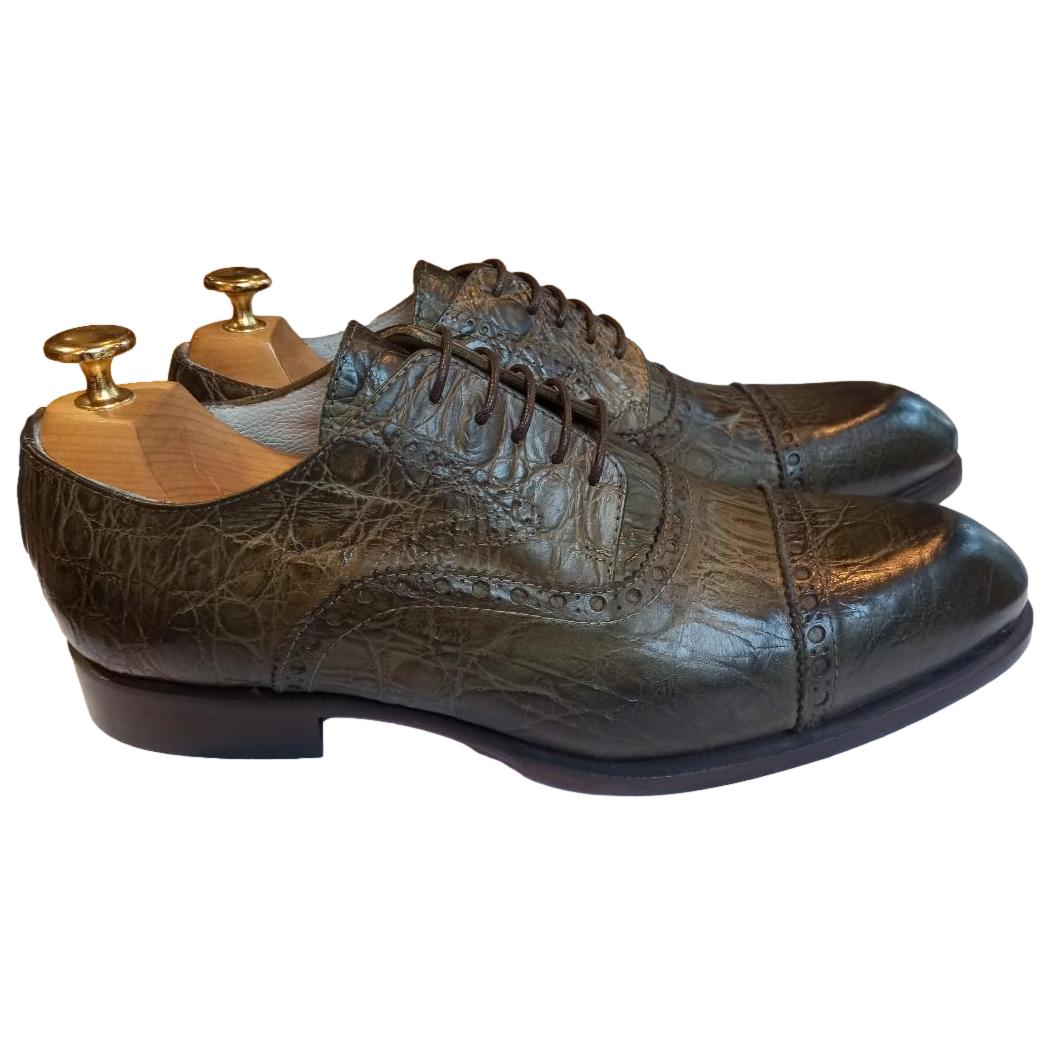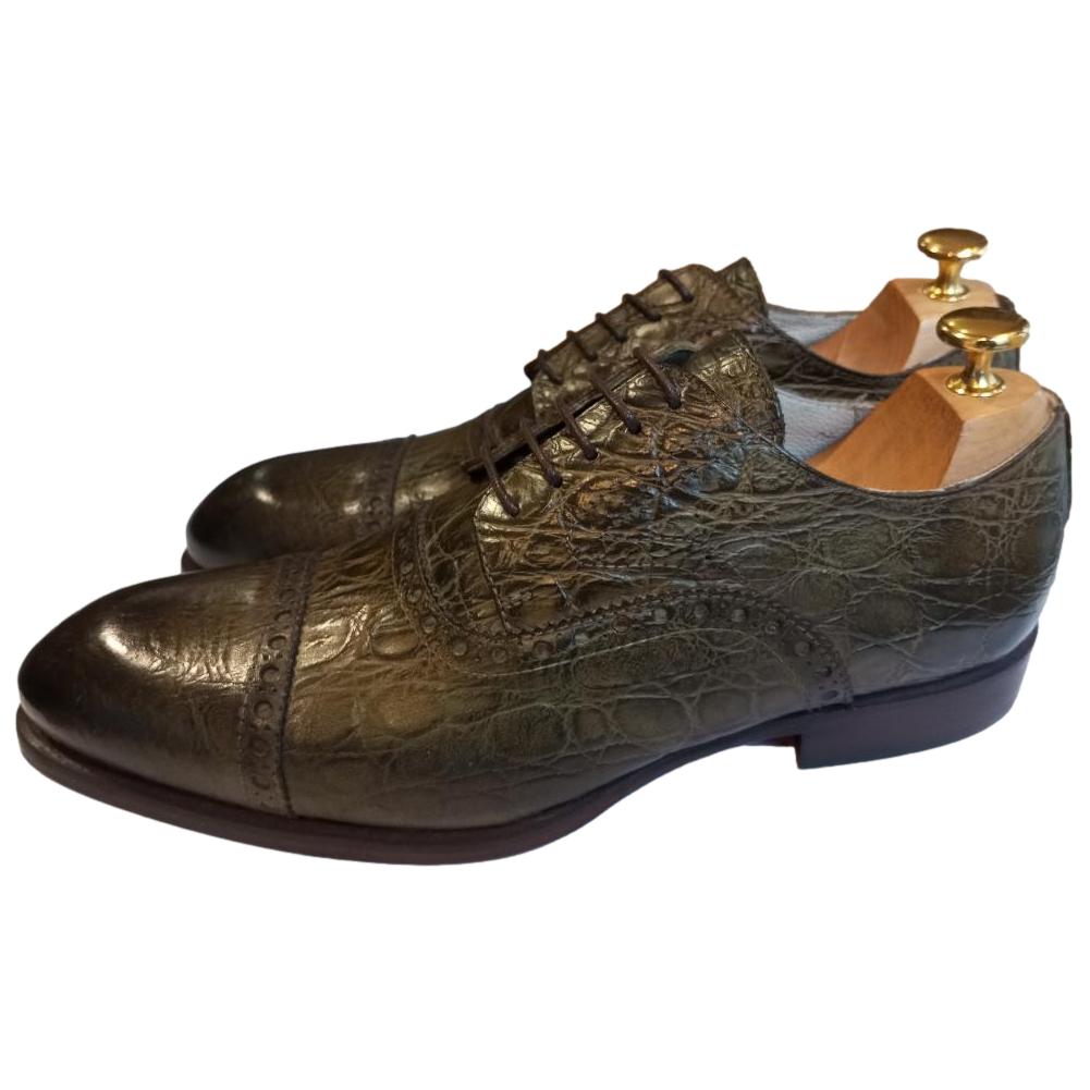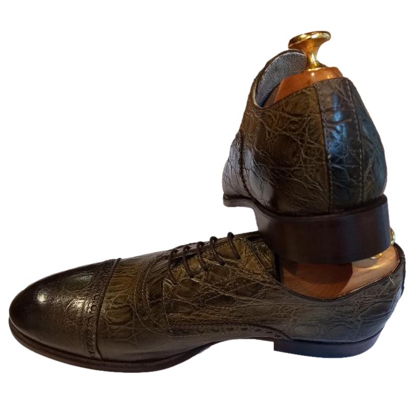 - La chaussure Richelieu Owen se distingue par son cuir de veau pleine fleur façon croco de couleur verte, alliant élégance et originalité.