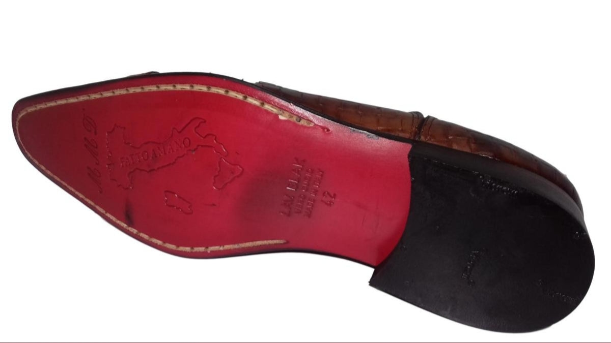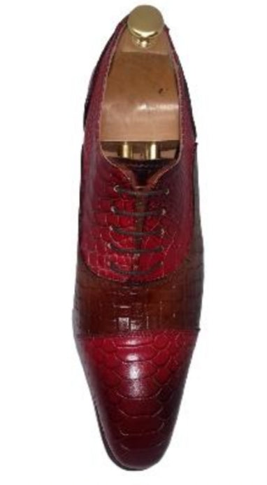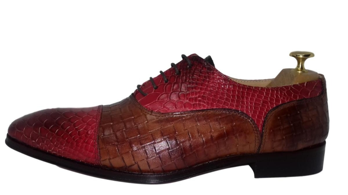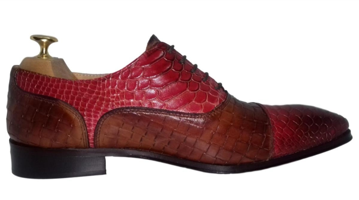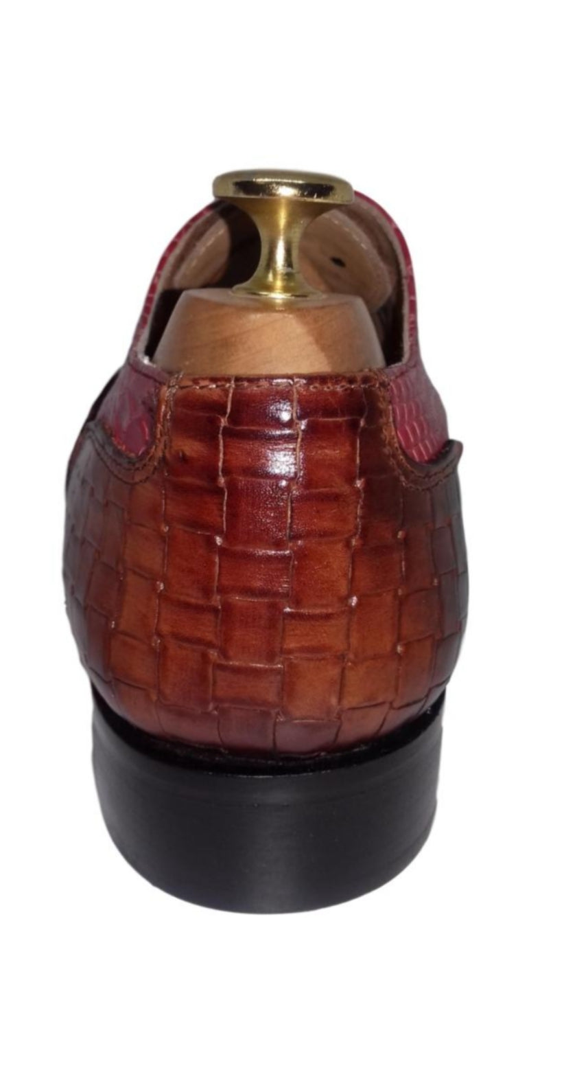 Cette chaussure en cuir bi-matière associe un cuir façon anaconda rouge bordeaux à un cuir tressé marron clair légèrement brûlé, offrant une esthétique raffinée et originale.