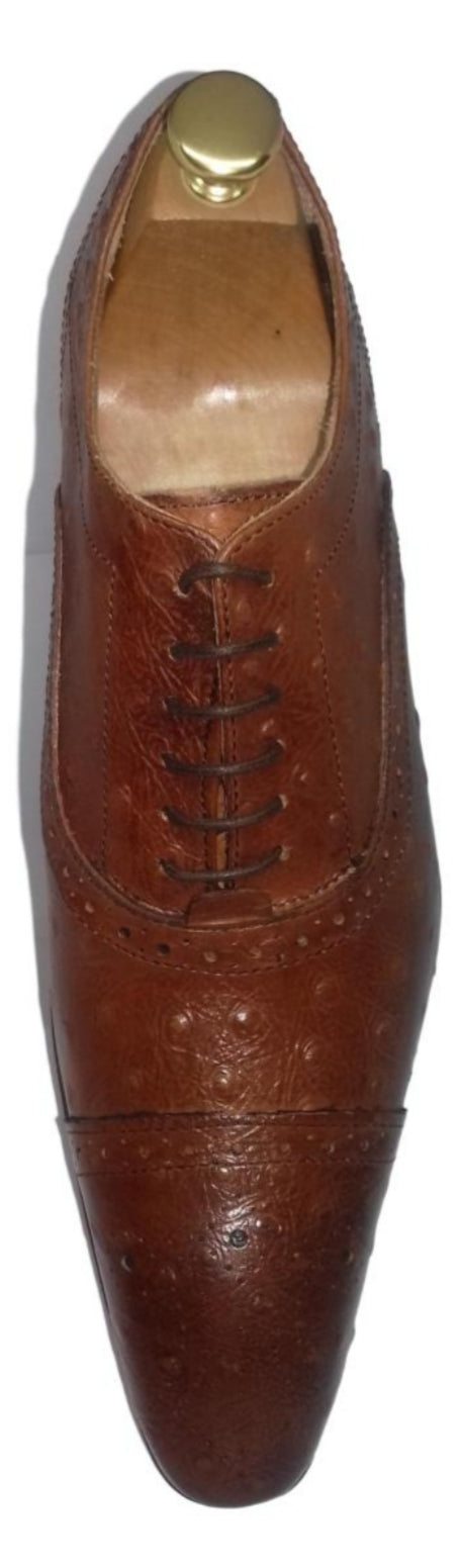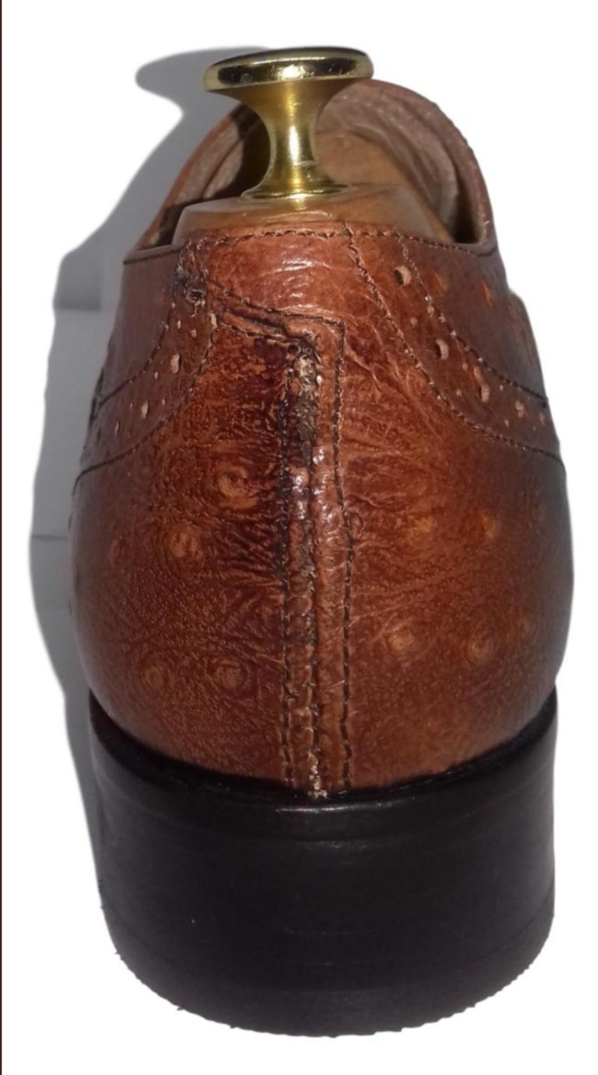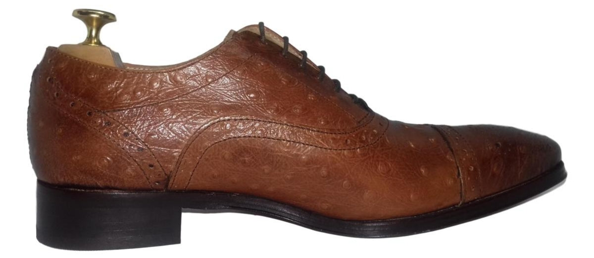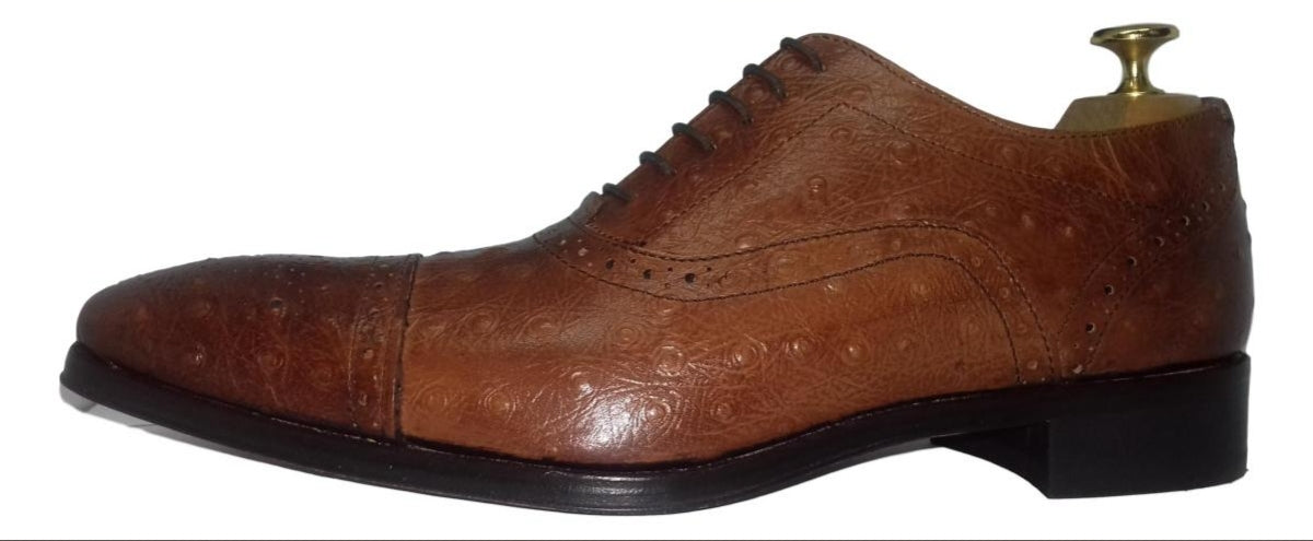 Cette chaussure Richelieu pour homme, en cuir de veau pleine fleur marron façon autruche, allie élégance et originalité.