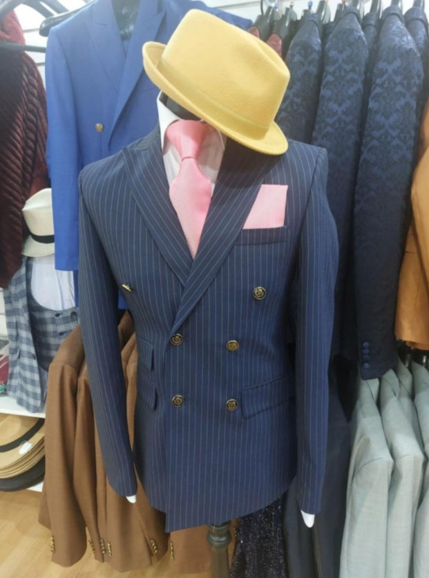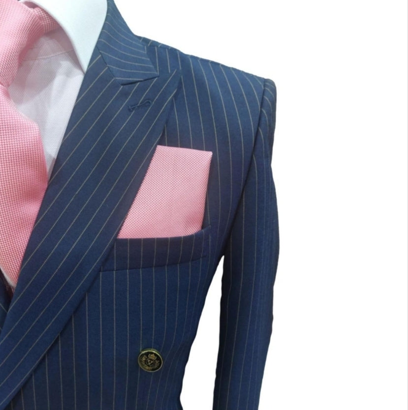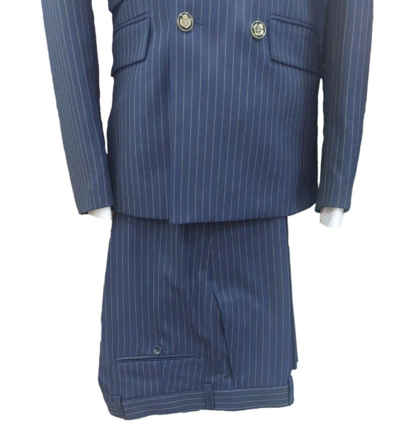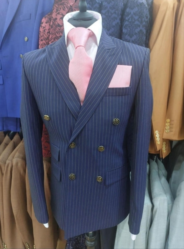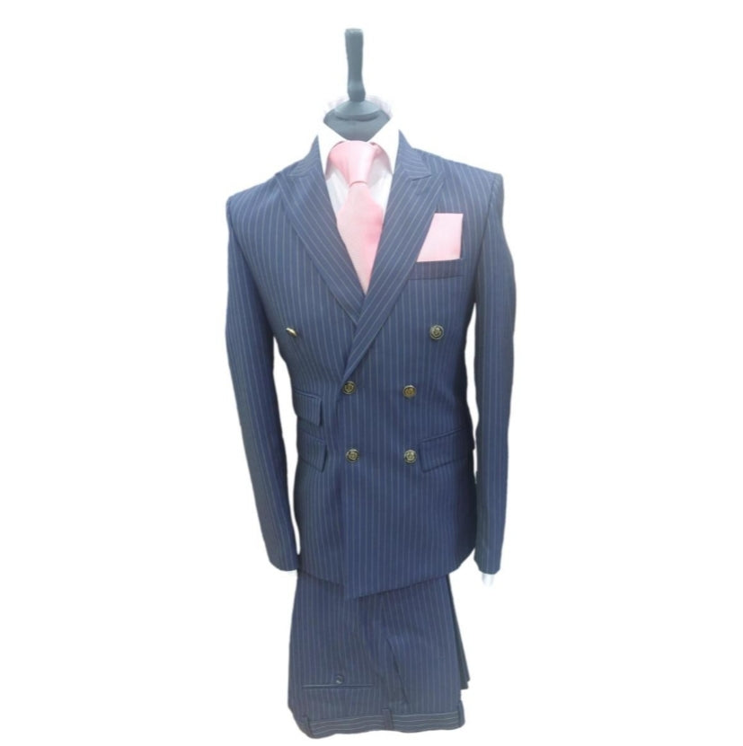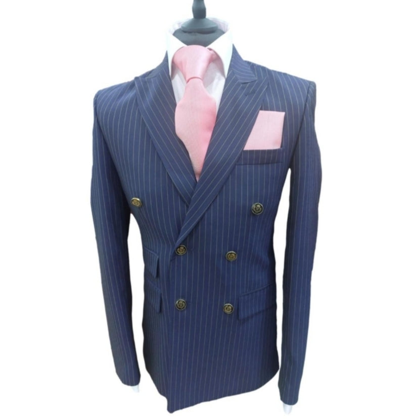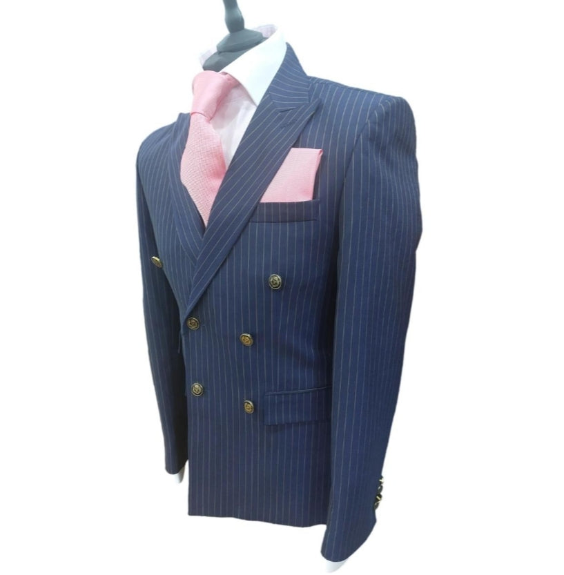 Le costume croisé Blaise allie élégance classique et modernité avec son tissu bleu à rayures et ses boutons dorés distinctifs.