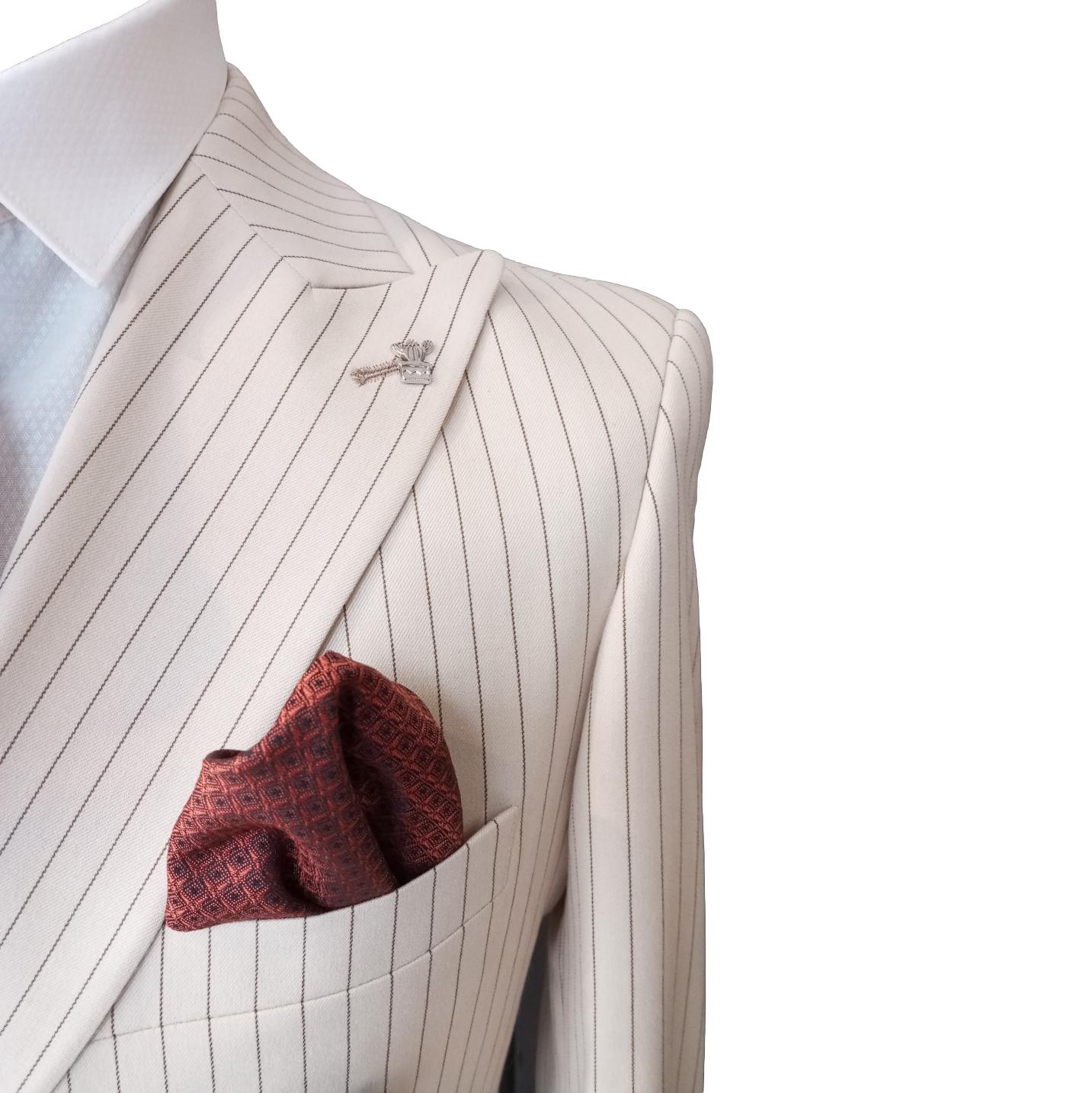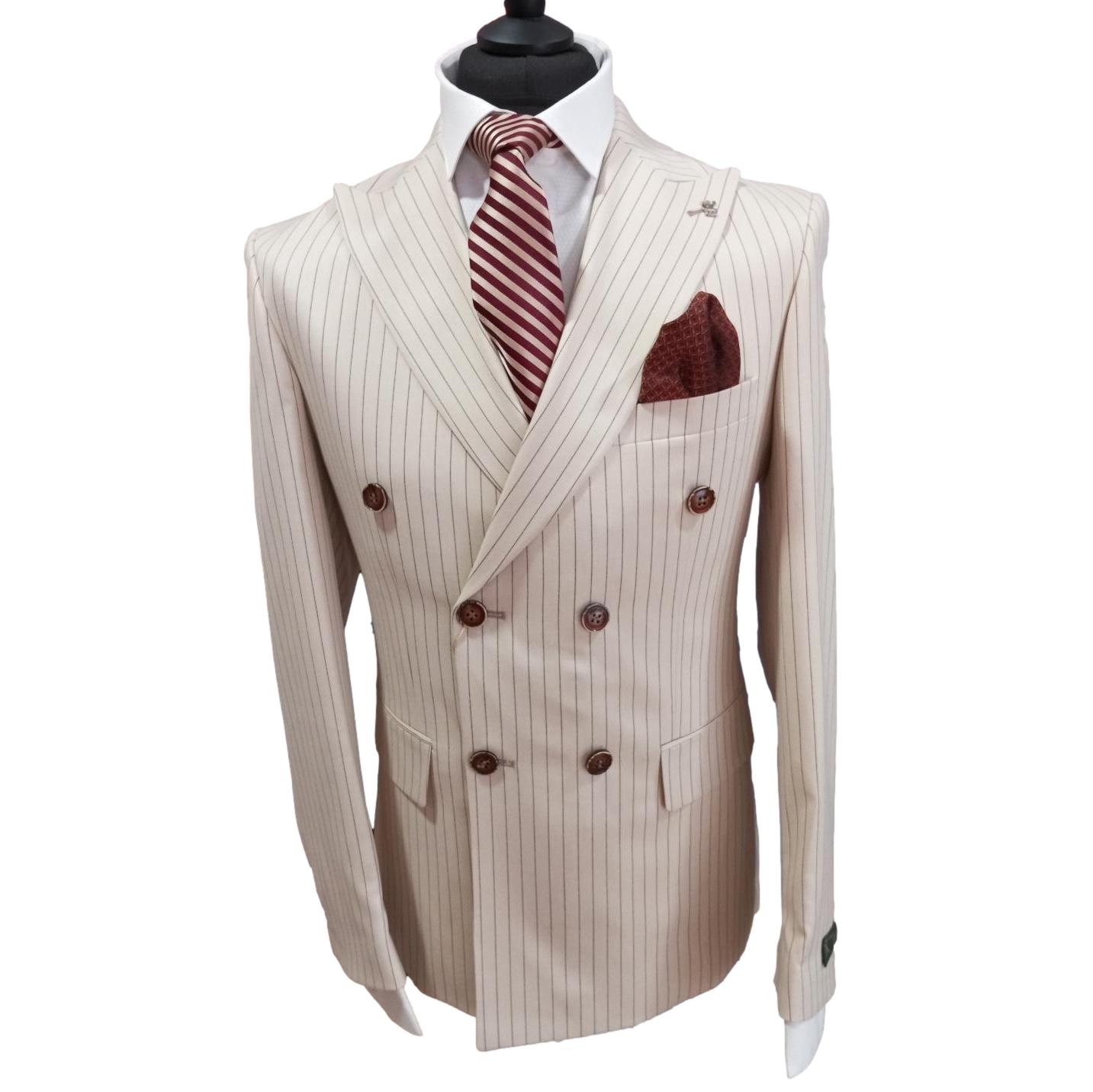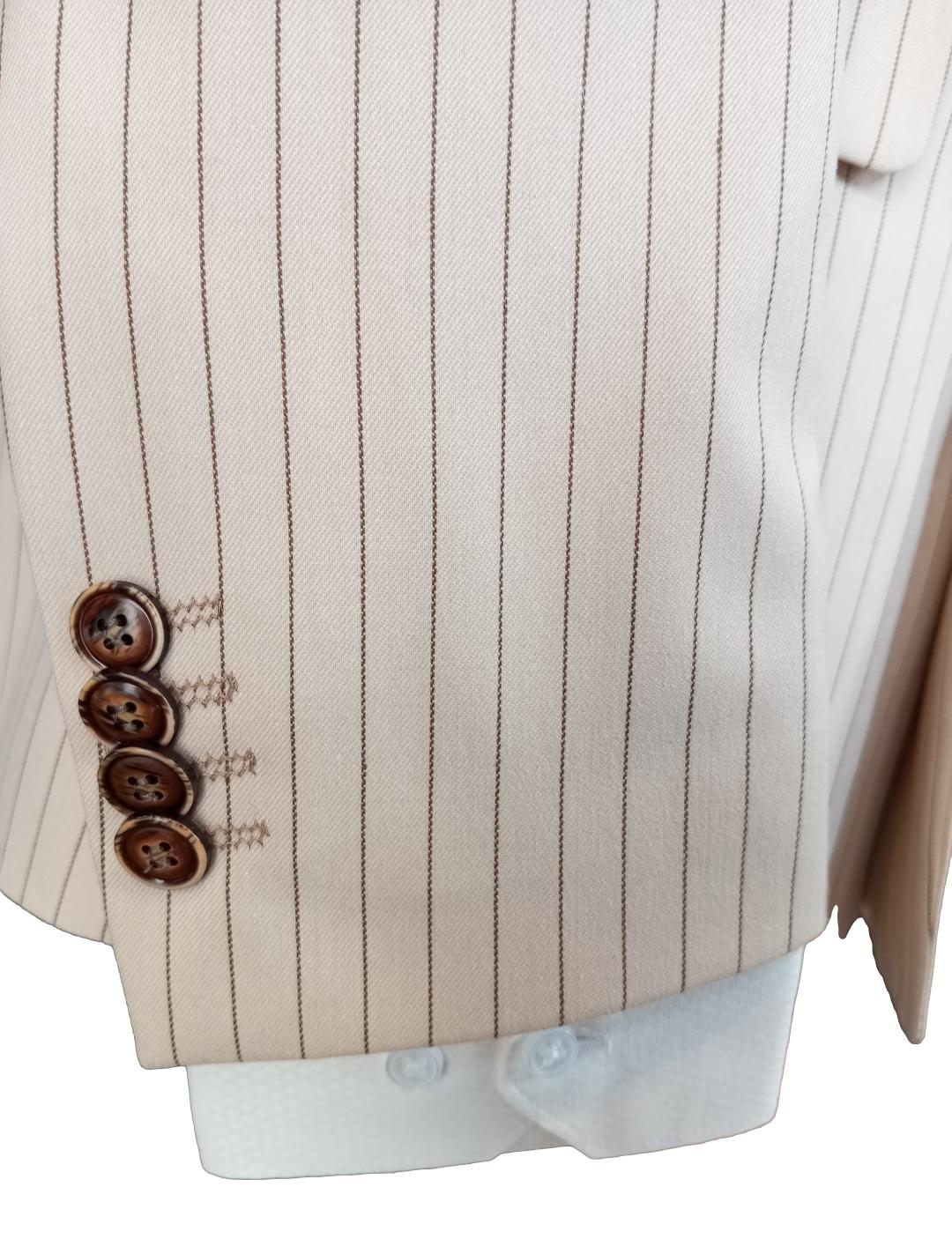 Sa teinte beige clair à rayures fines, associée à une veste à 4 boutons et deux fentes d’aisance, confère un style chic et raffiné.