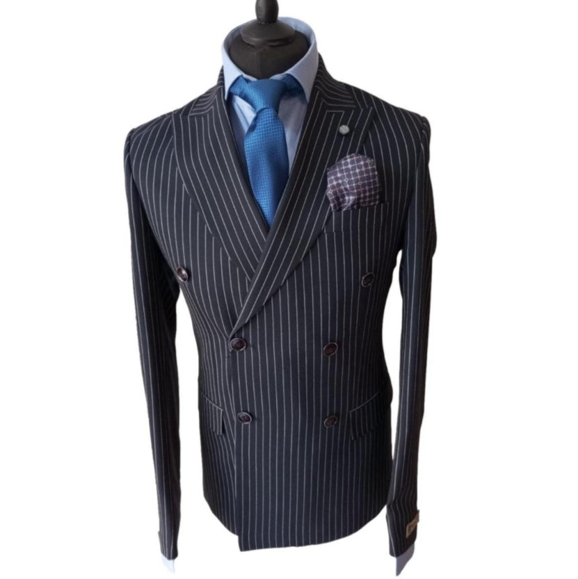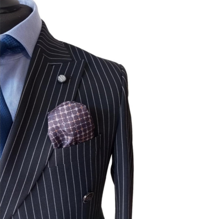 Le costume croisé Borsalino allie élégance classique et modernité avec son tissu bleu de nuit à rayures.