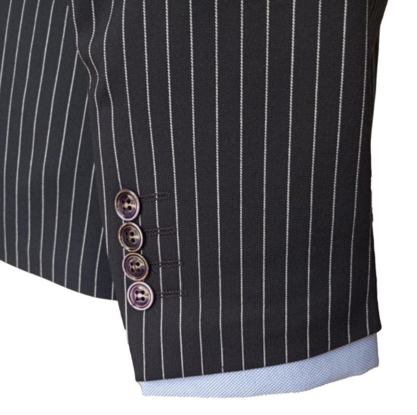 La veste à 4 boutons, dotée de deux fentes d’aisance au dos, s’accompagne d’un pantalon assorti pour un ensemble harmonieux.