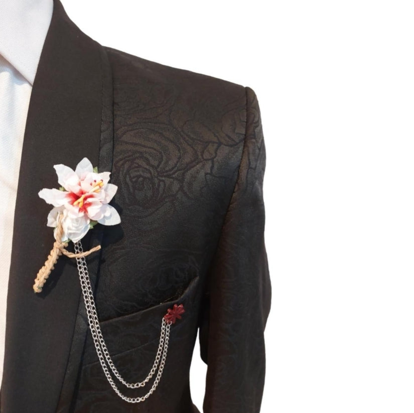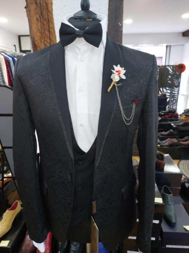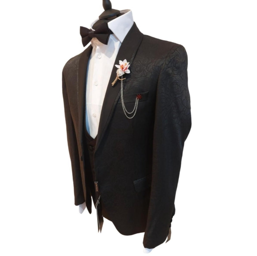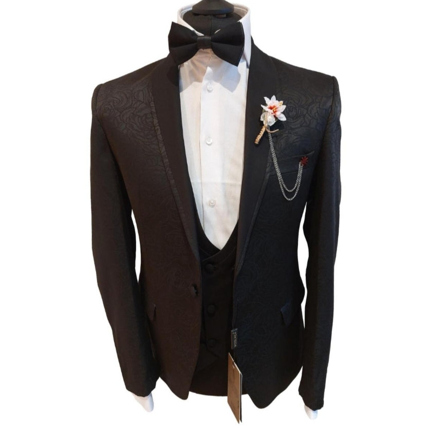 Le costume de cérémonie Oscar noir allie élégance et originalité grâce à son tissu en viscose-polyester orné de motifs floraux subtils.