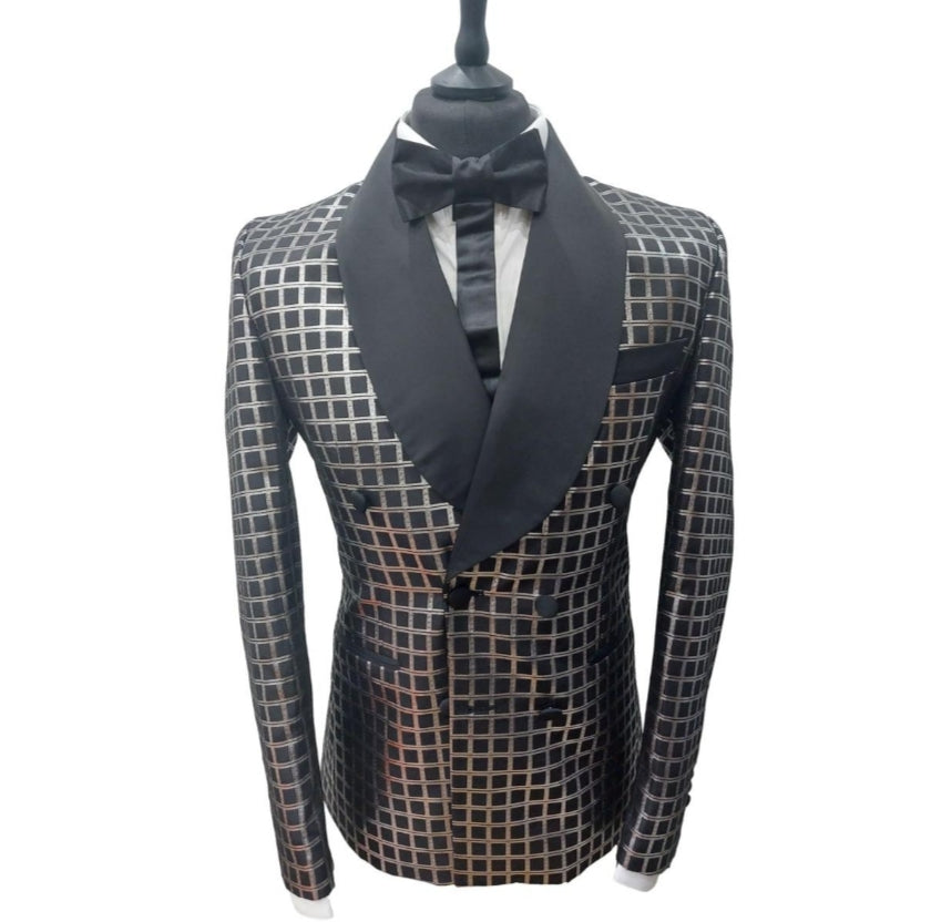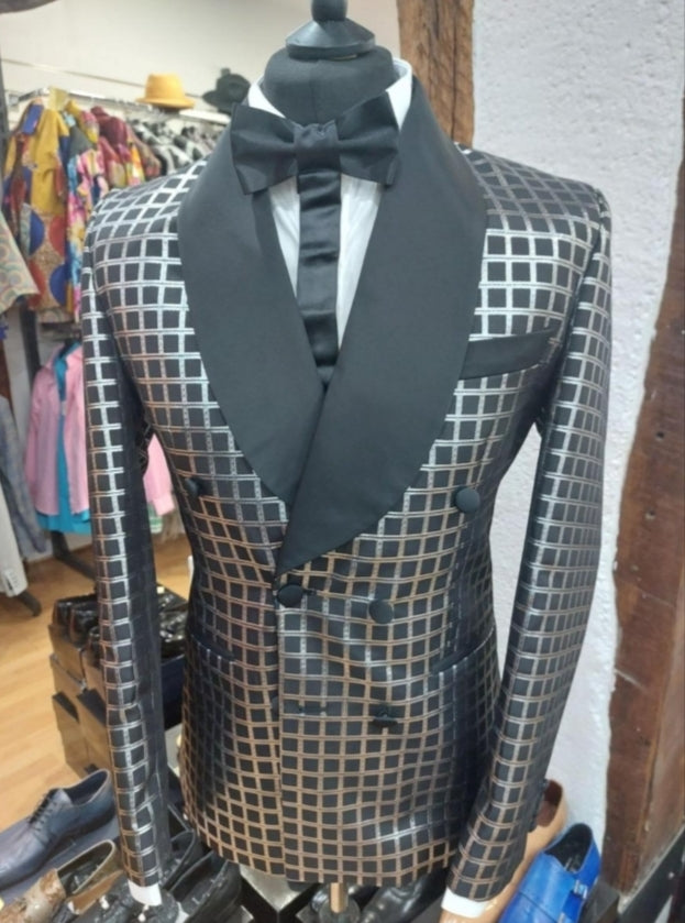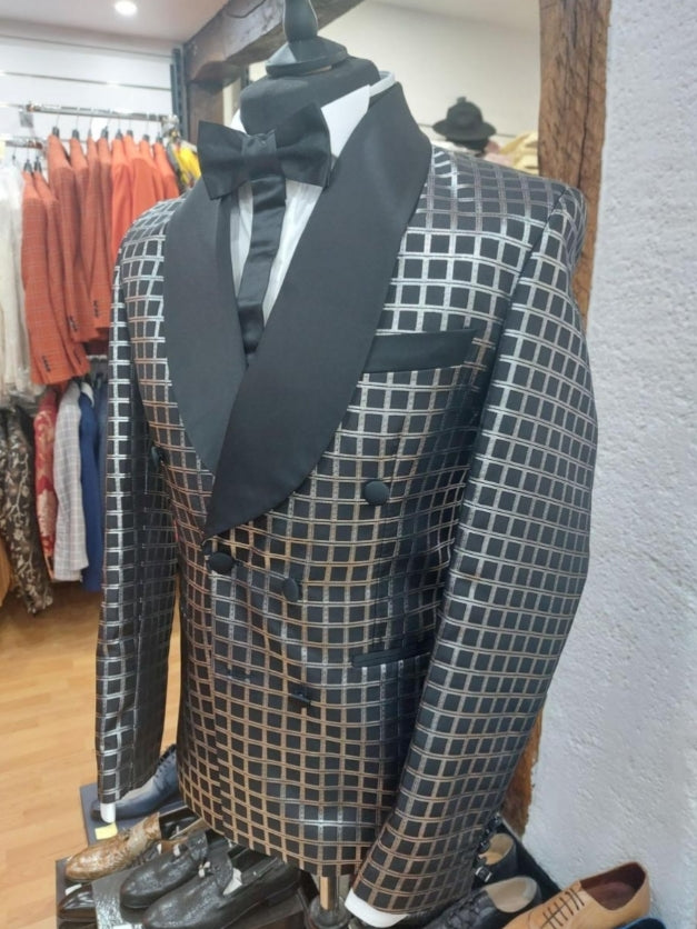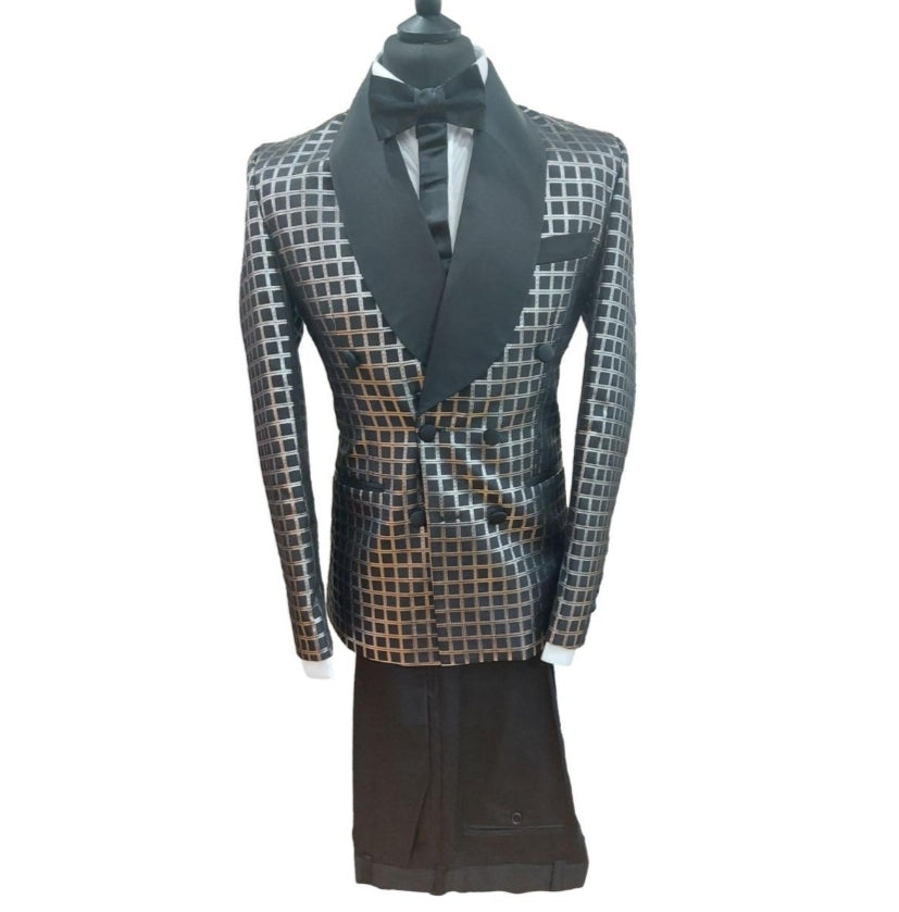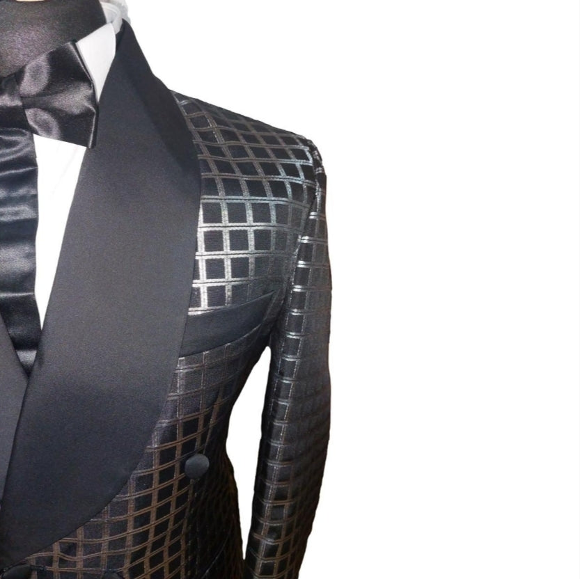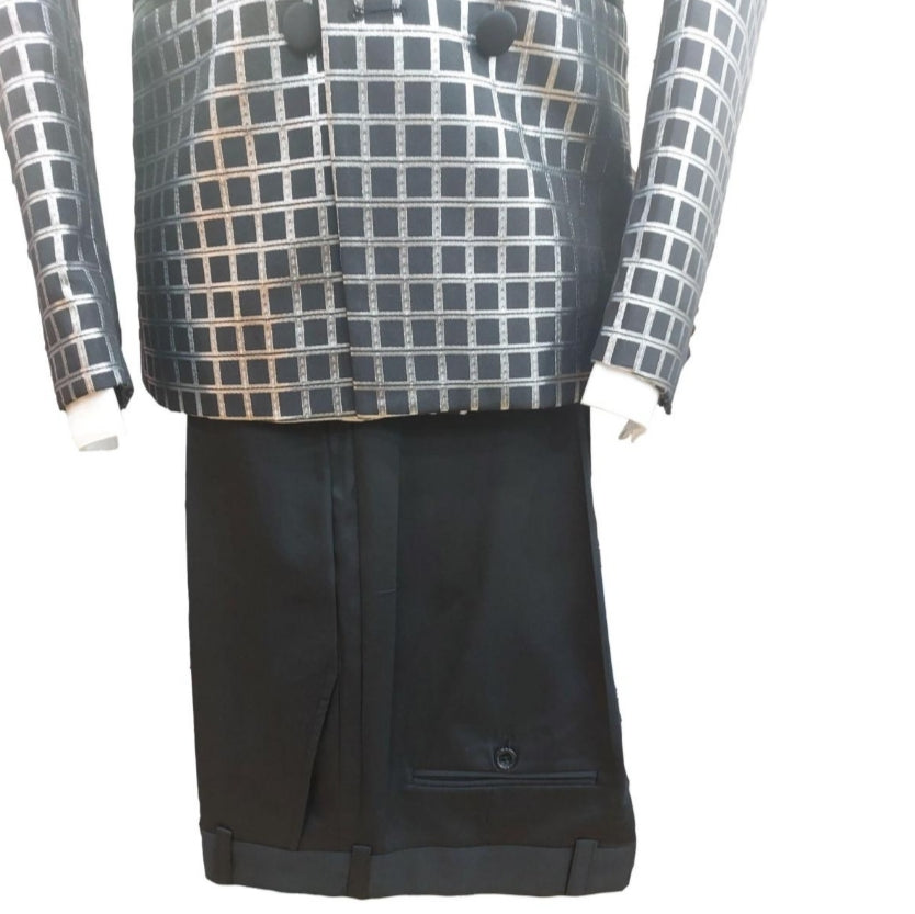 Le costume de cérémonie Valantino à carreaux noir et gris allie originalité et élégance grâce à son motif unique et son col satiné noir.