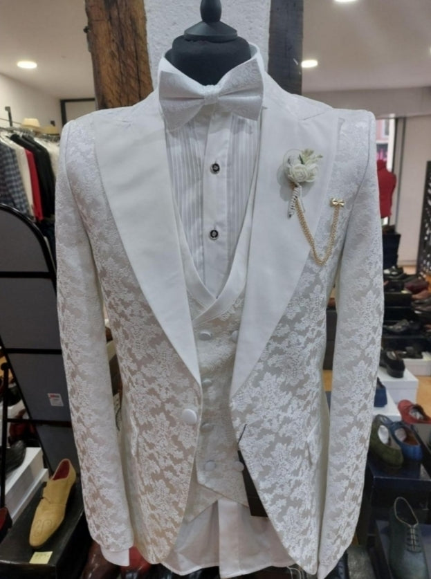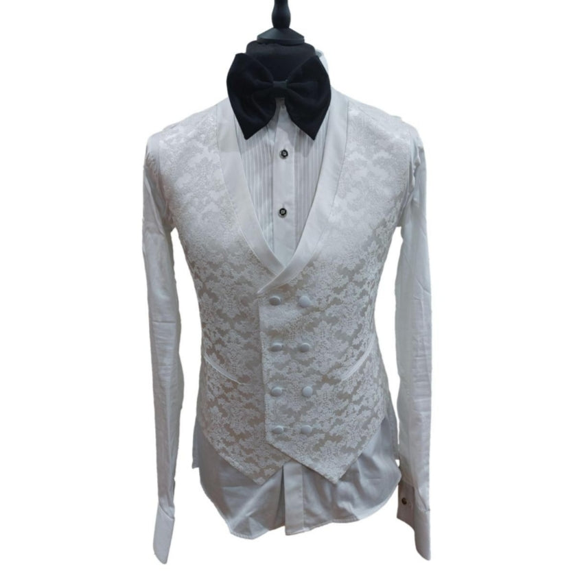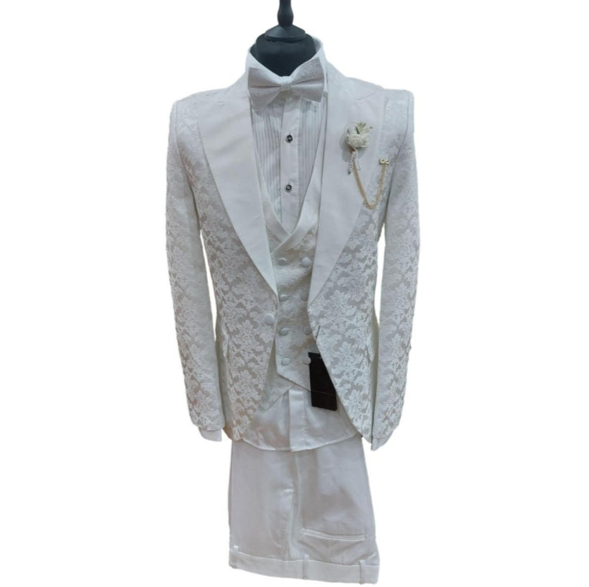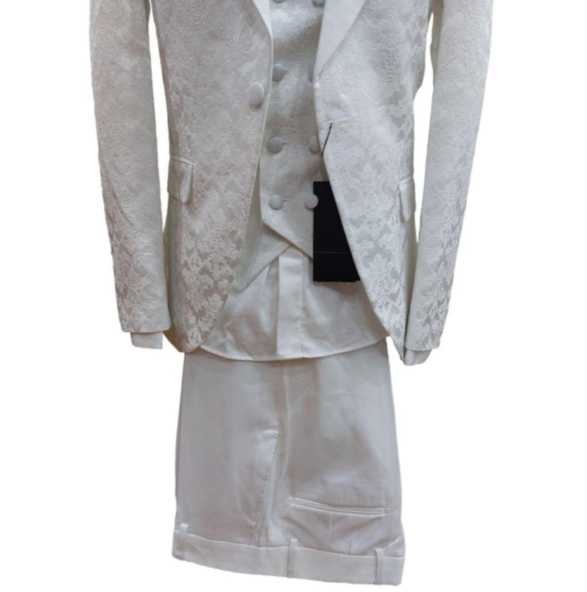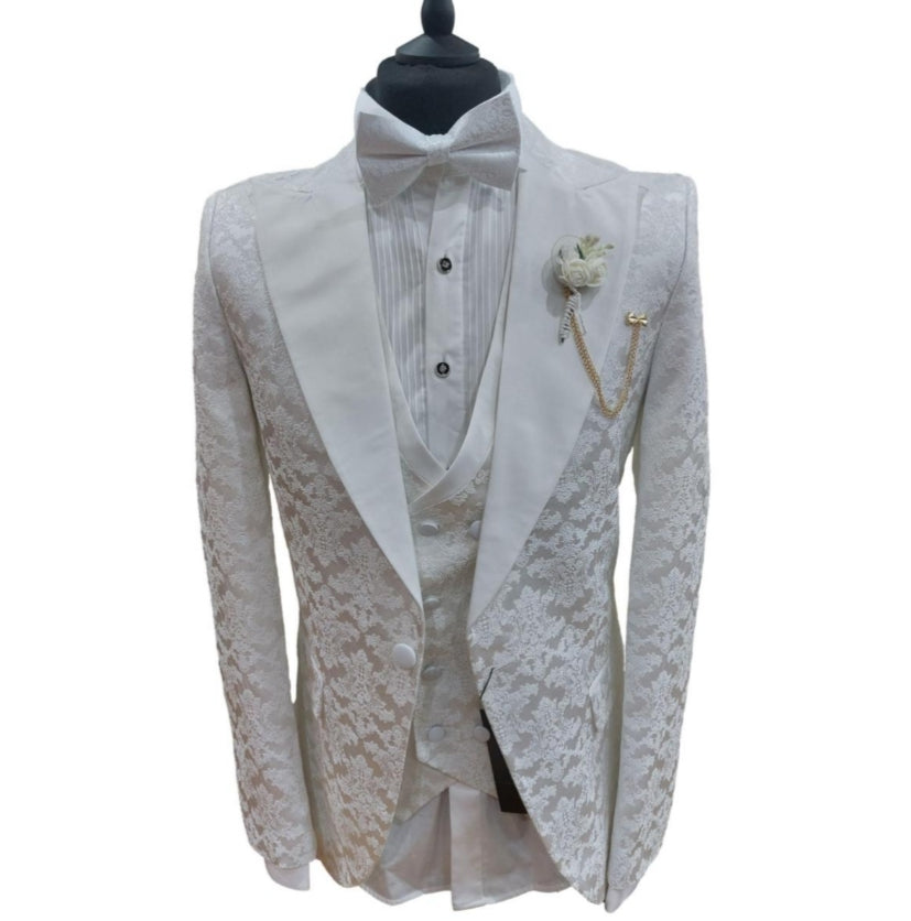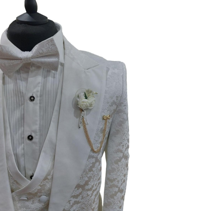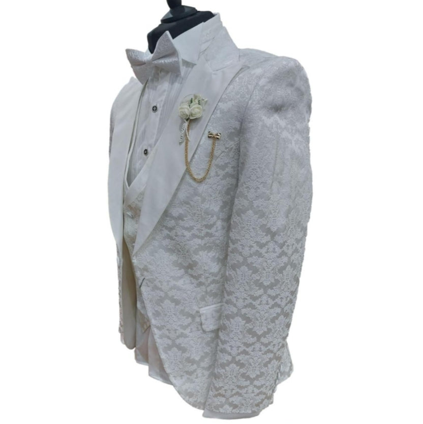 Ce modèle smoking trois pièces comprend une veste tuxedo à fleurs avec col satiné blanc, un gilet croisé à huit boutons assorti, et un pantalon smoking blanc satiné.