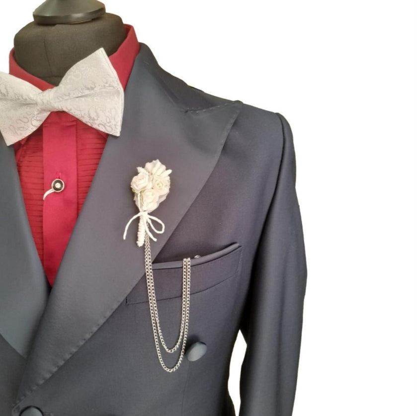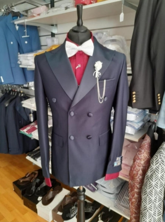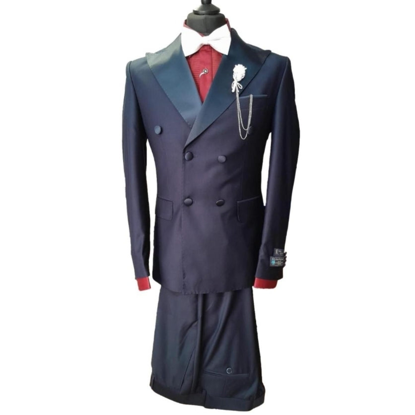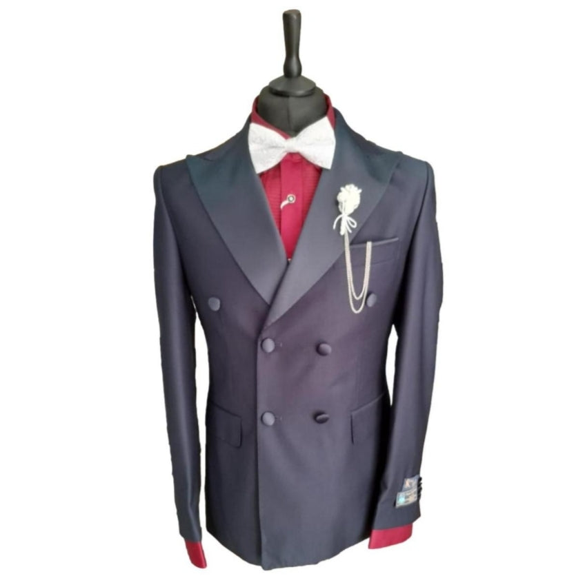 Le costume de cérémonie croisé Armando bleu de nuit allie élégance et originalité grâce à son coloris intemporel et son col satiné assorti.