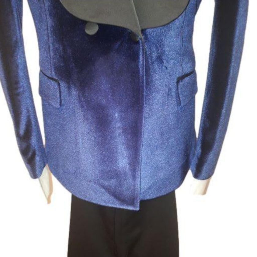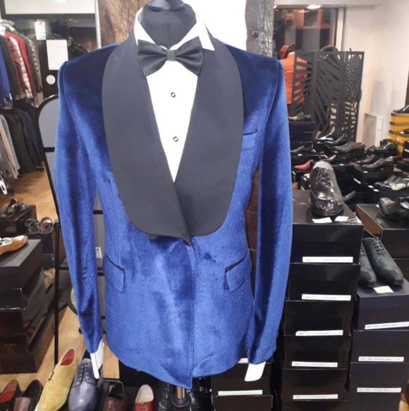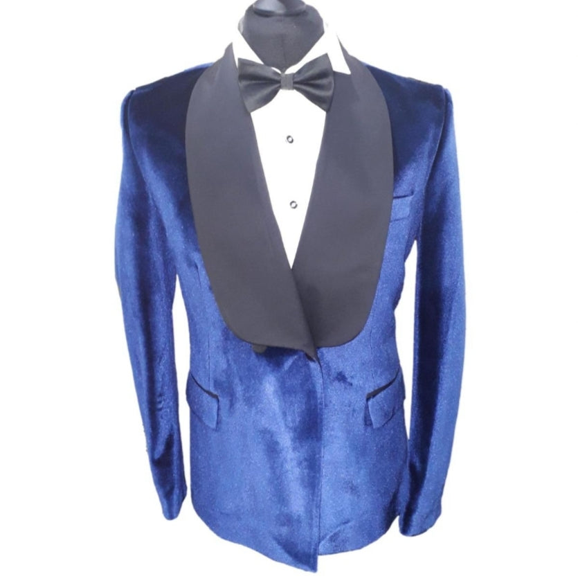 Le costume de cérémonie croisé bleu Melbourne allie élégance et originalité grâce à son tissu en velours bleu à fleurs et son col satiné noir.