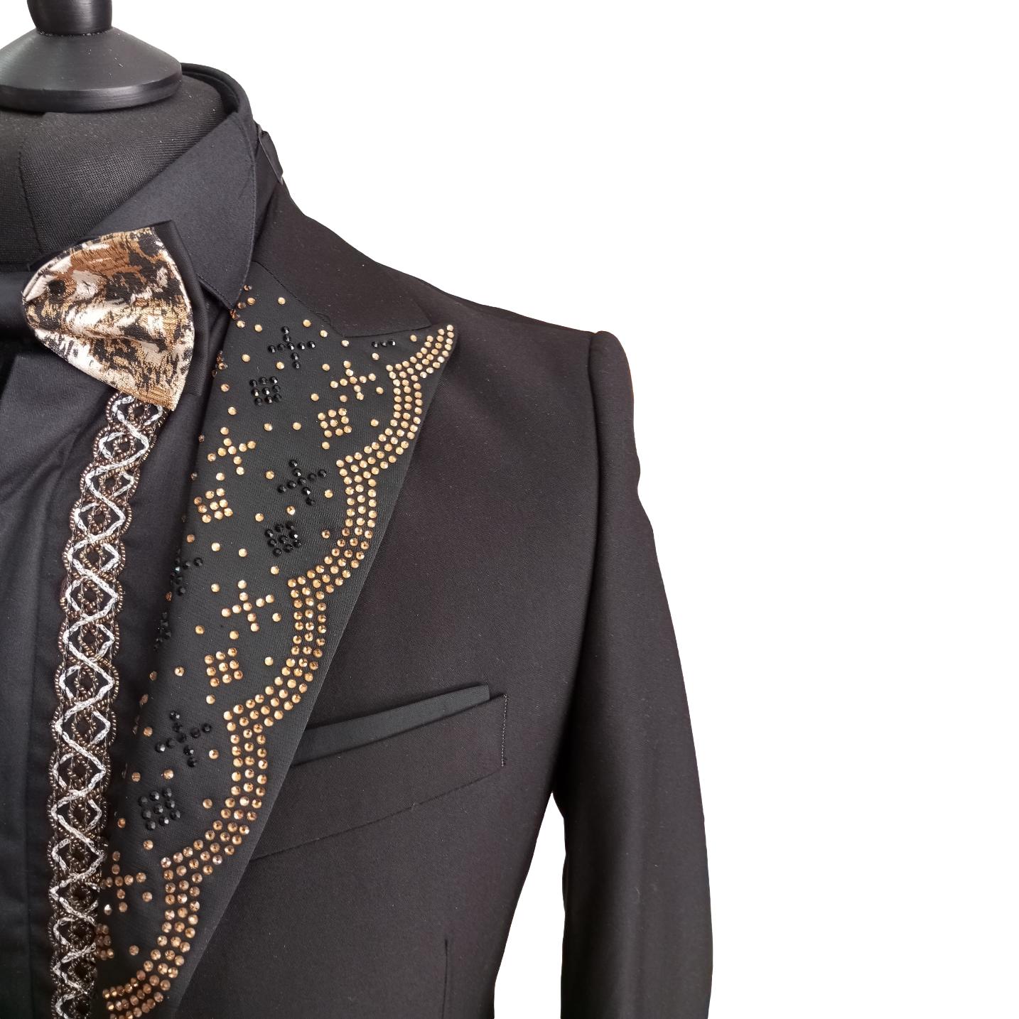 Le costume de cérémonie homme 2 pièces noir et or Lorenzo allie originalité et élégance grâce à son tissu en mélange laine-viscose de haute qualité.