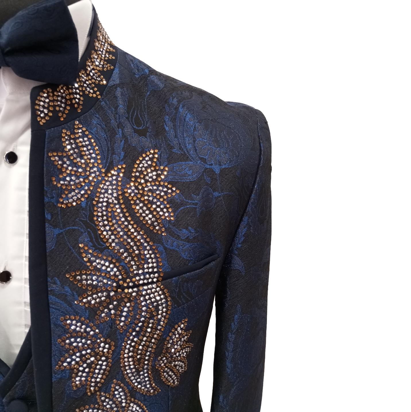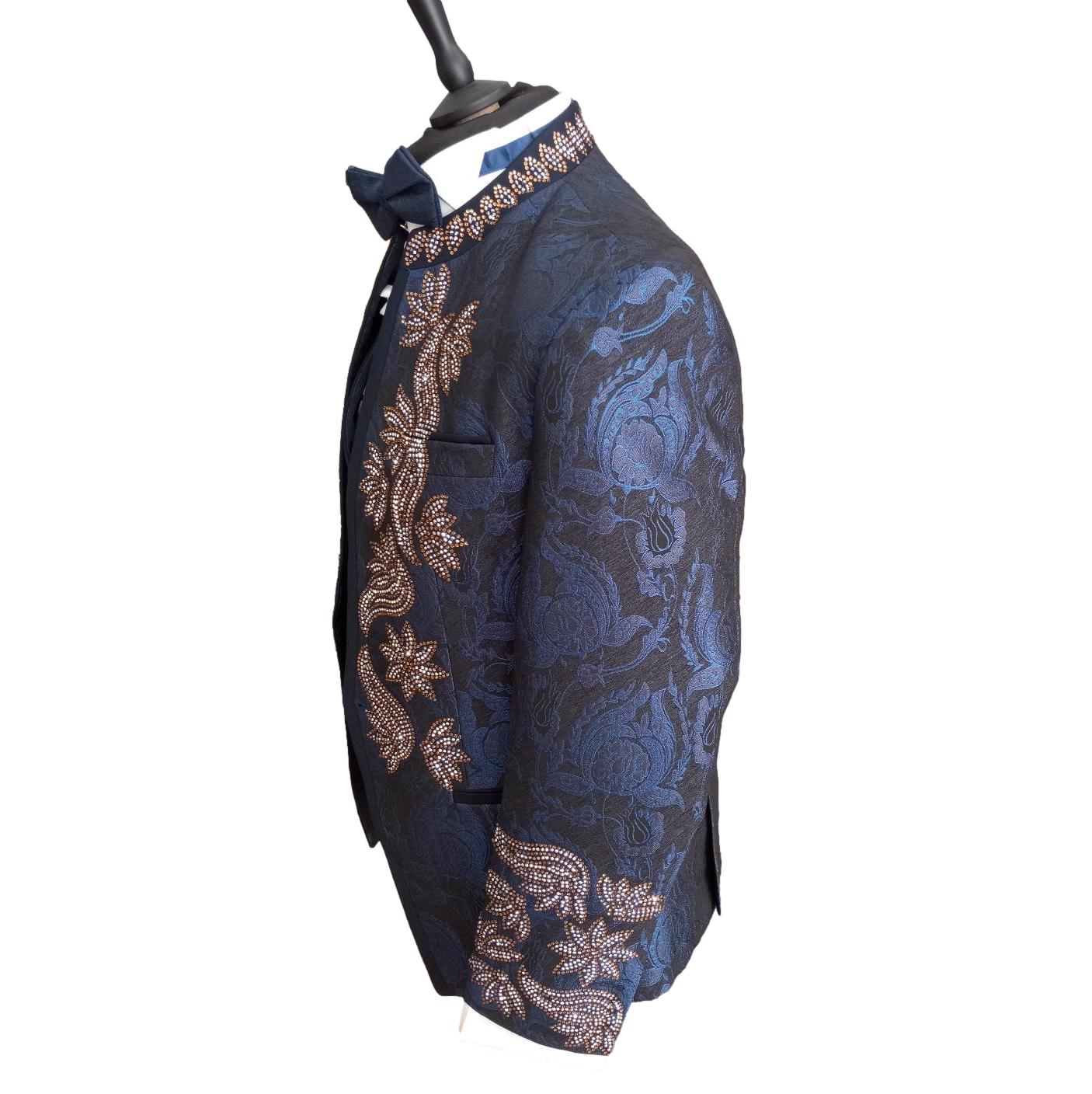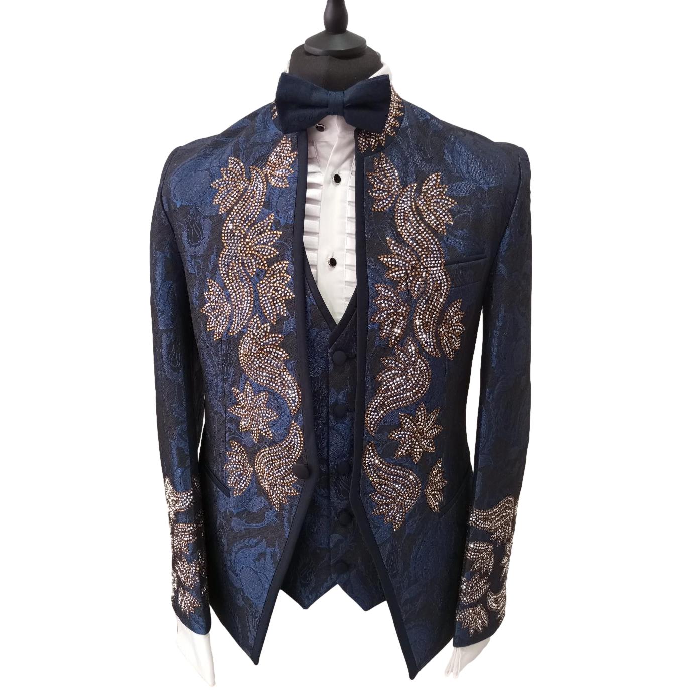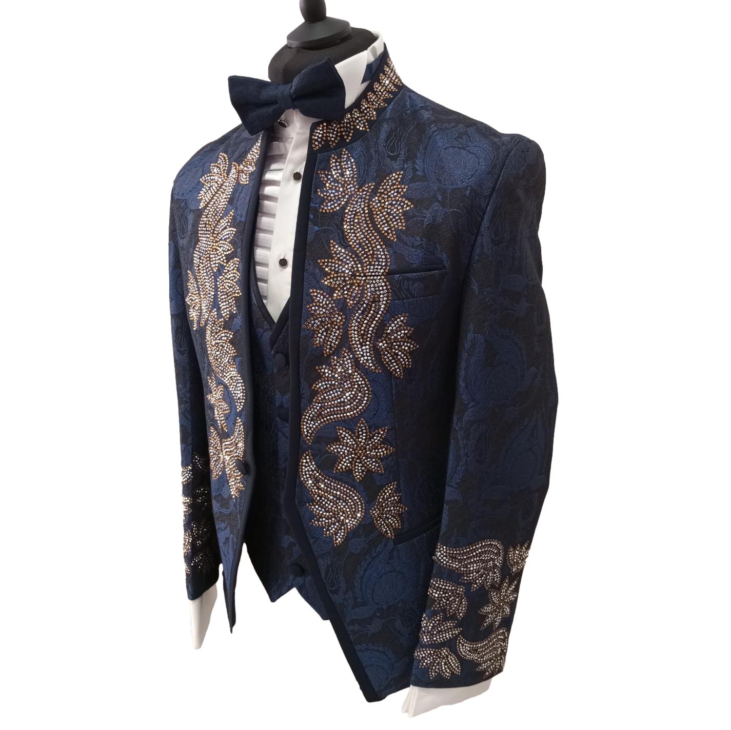 Le costume de cérémonie Firenze allie élégance et originalité avec son motif fleuri bleu de nuit et or, rehaussé de pierres scintillantes dorées sur le col, le devant et les bras.