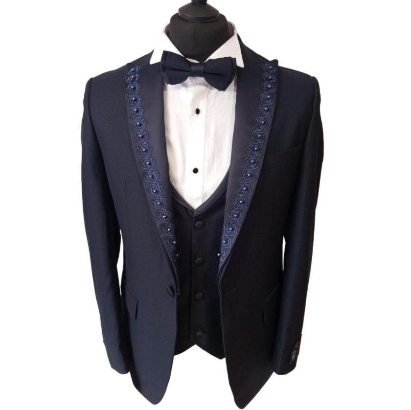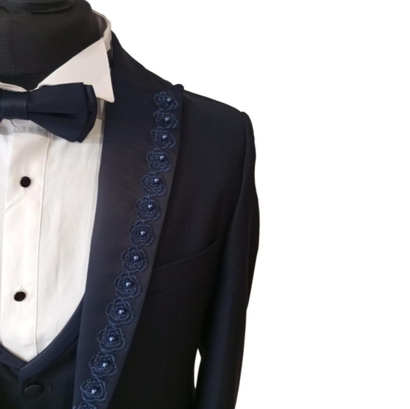 Ce modèle smoking comprend une veste slim à un bouton avec un col satiné fleuri orné de perles bleues, un gilet à quatre boutons et un pantalon assorti.