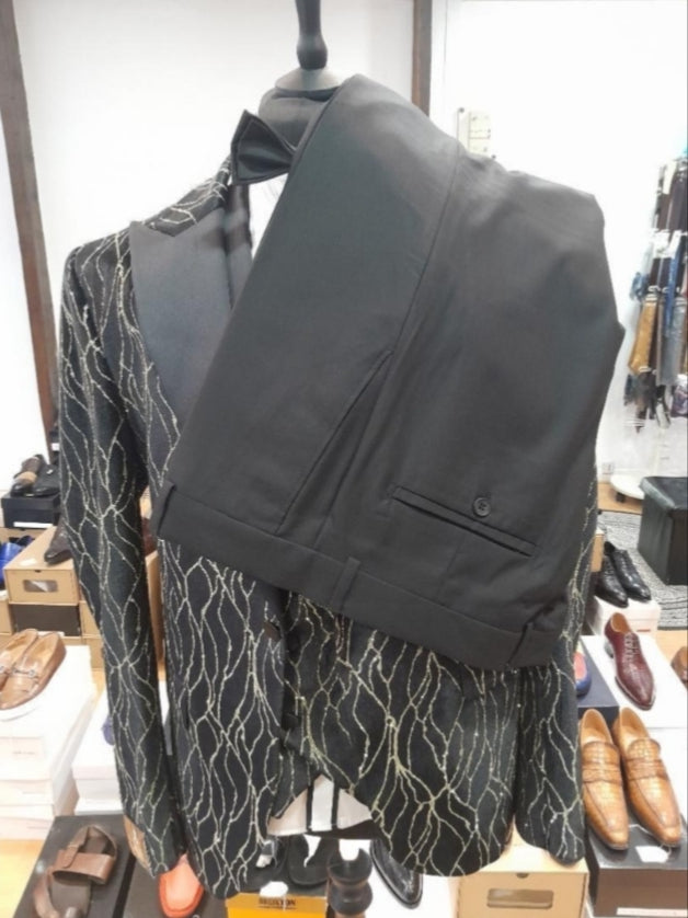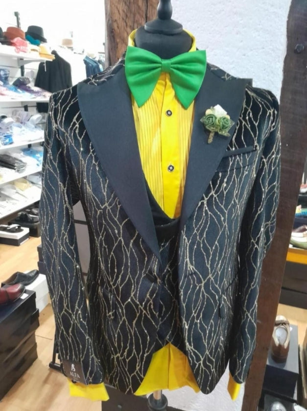 Le costume de cérémonie Rivoli allie élégance et originalité avec son tissu noir orné de paillettes dorées, offrant un style chic et raffiné.
