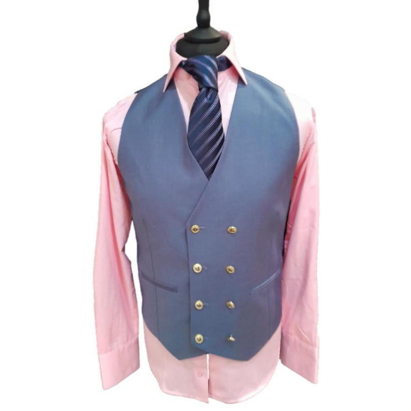 Composé d’une veste bleu à un bouton avec deux fentes d’aisance, d’un pantalon assorti et d’un gilet marron clair à huit boutons, il se distingue par ses boutons dorés qui apportent une touche chic.