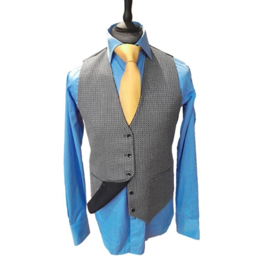 Composé d’une veste bleu de nuit à un bouton, d’un pantalon assorti et d’un gilet réversible bleu de nuit et carreaux bleu-blanc, il offre polyvalence et style raffiné.