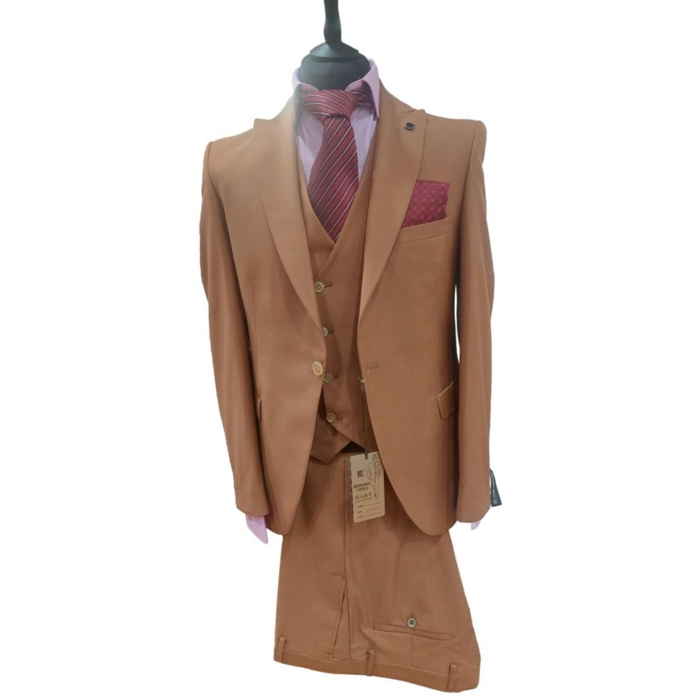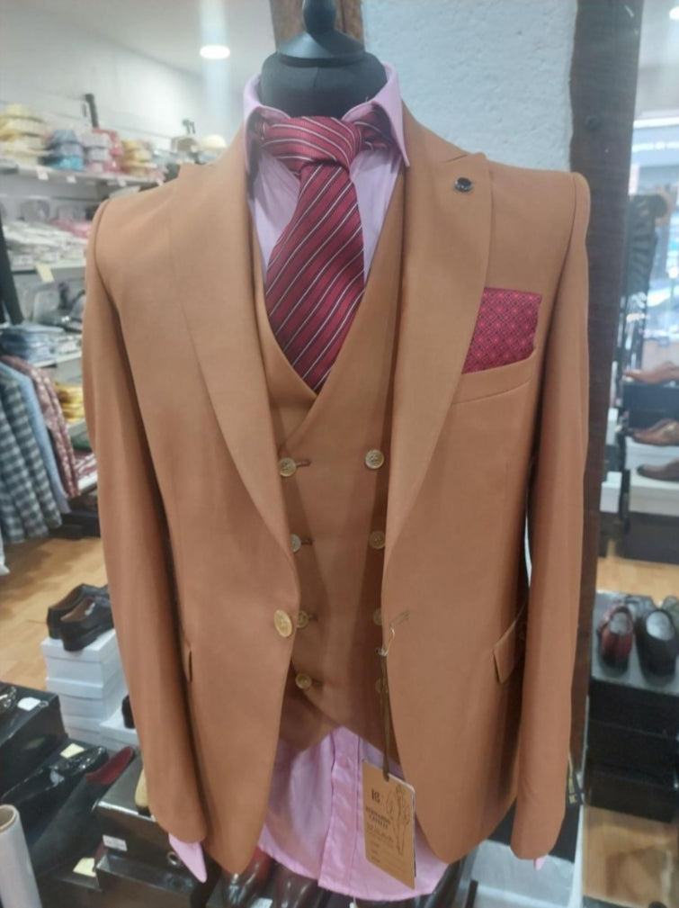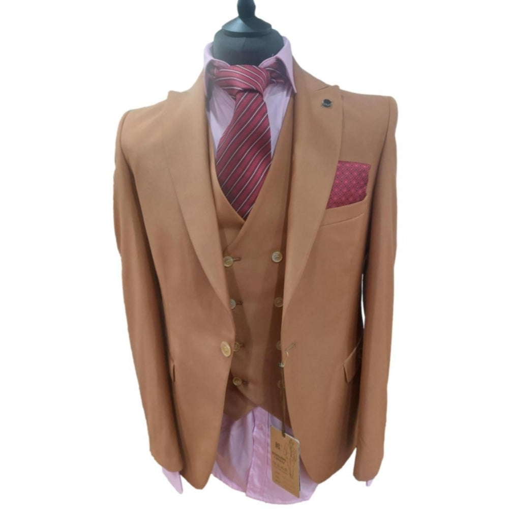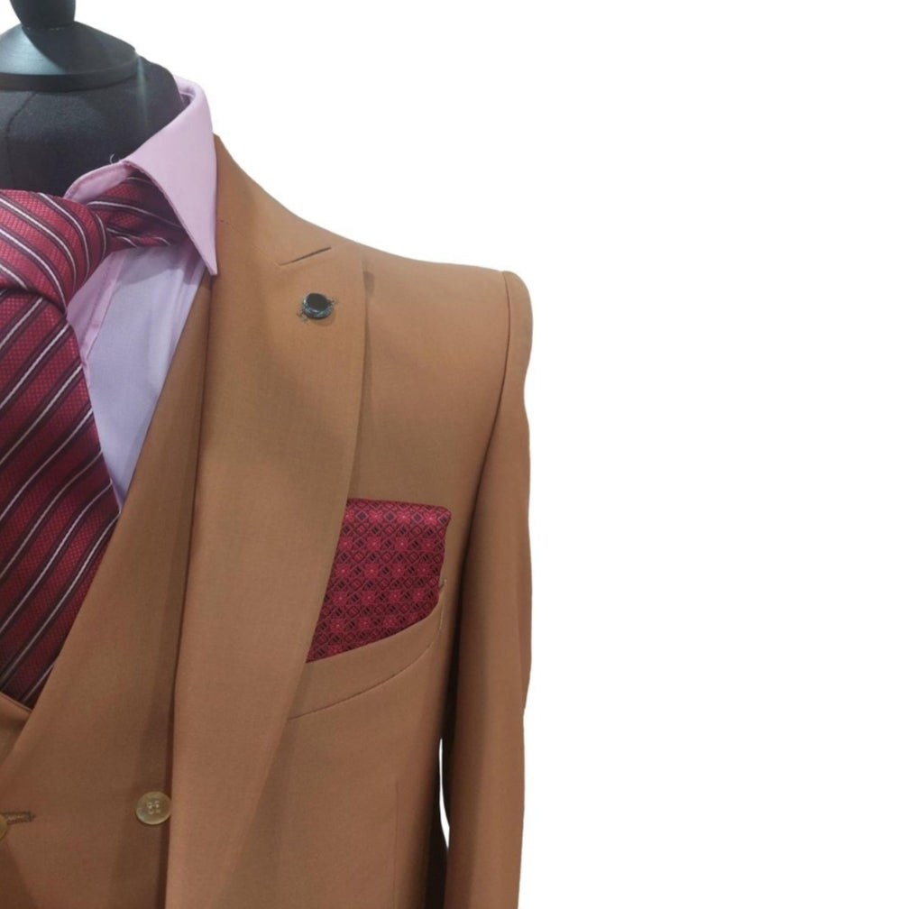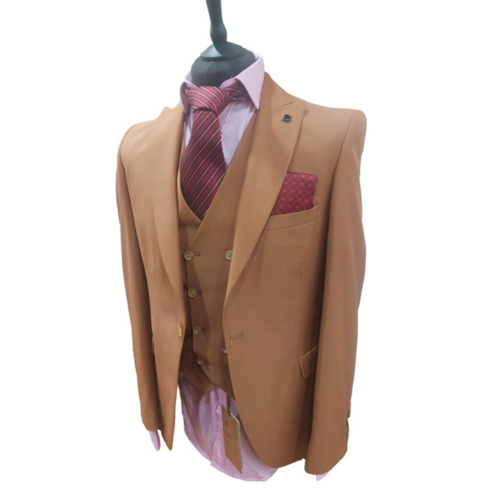 Composé d'une veste à un bouton avec deux fentes d'aisance, d'un pantalon et d'un gilet à huit boutons, le tout en marron clair, il offre un style raffiné pour vos occasions habillées.