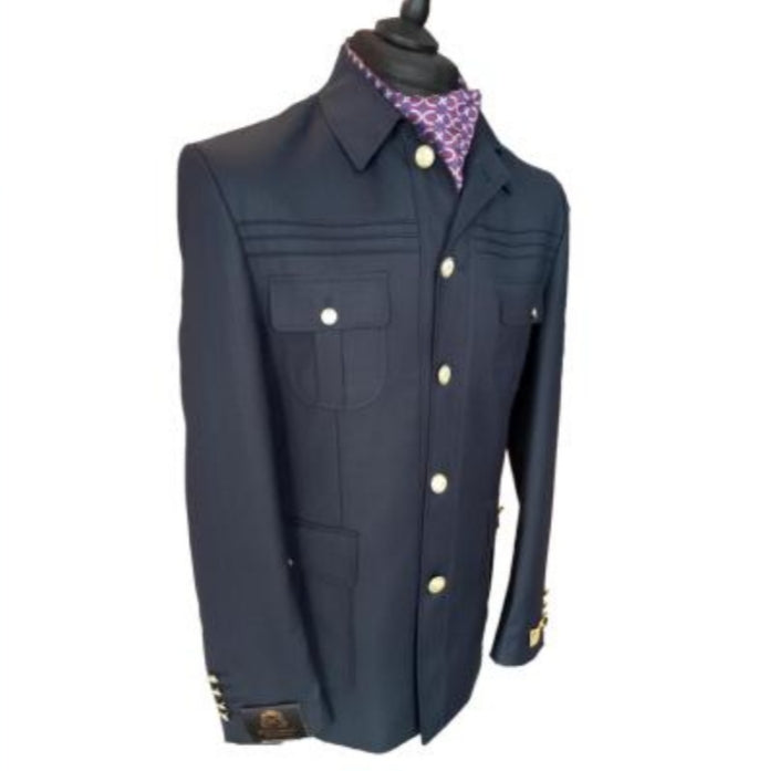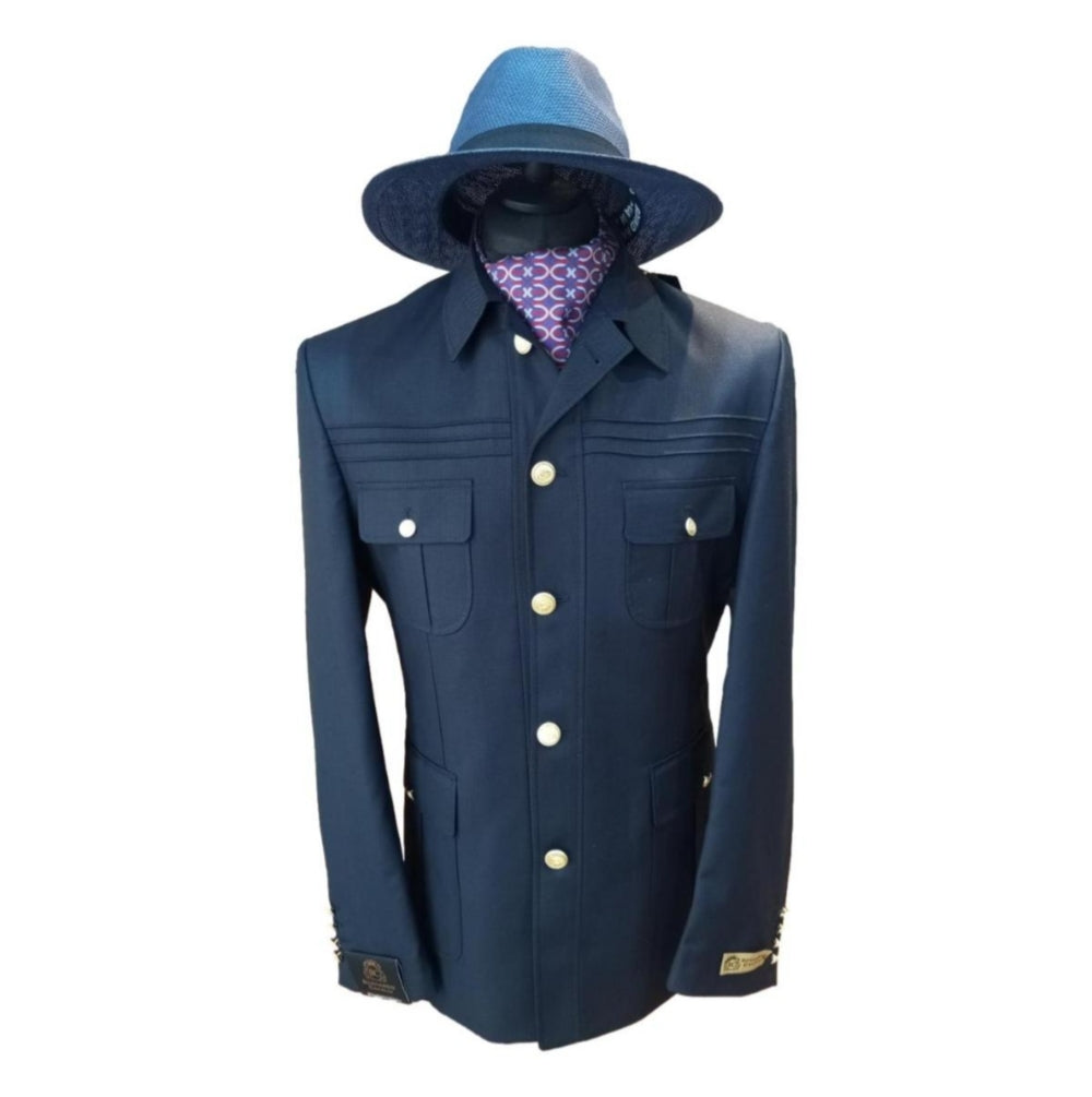 Le costume safari Jason est un modèle élégant et contemporain, conçu en bleu avec des boutons dorés droits qui lui confèrent une allure chic.