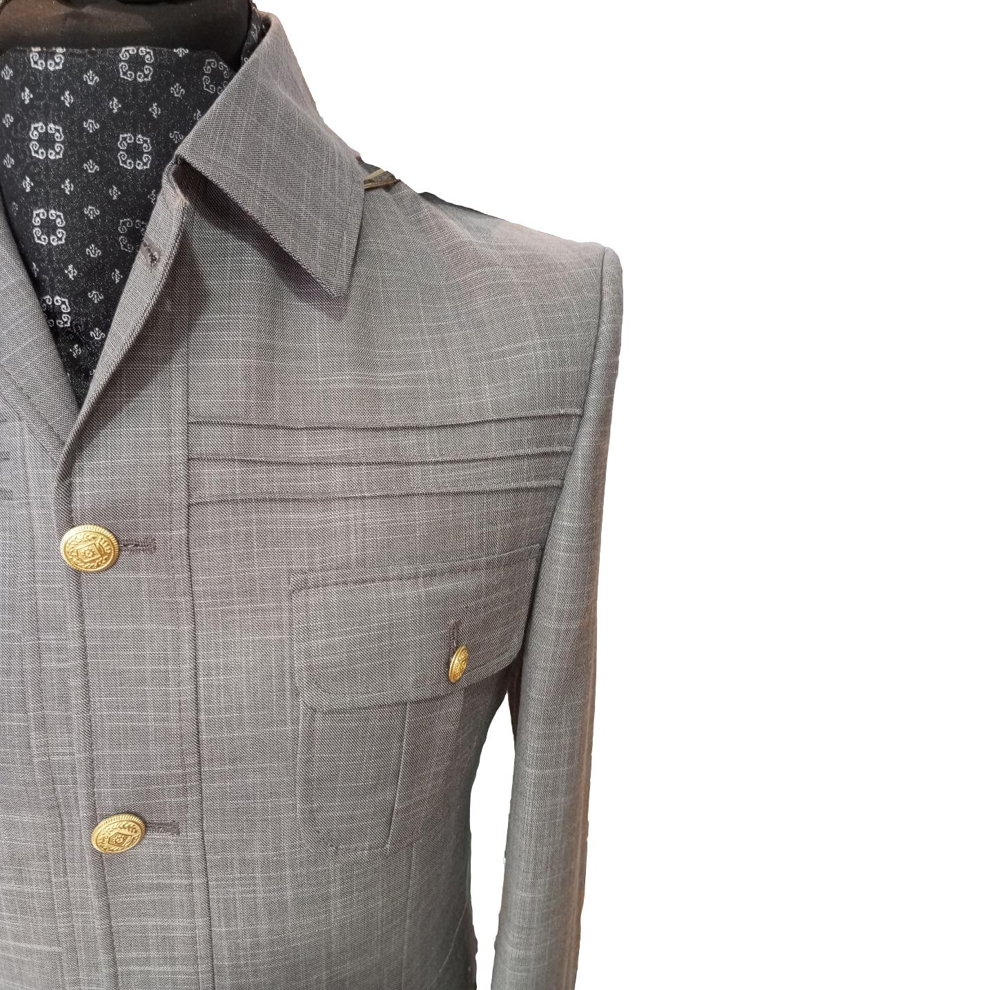 La veste se distingue par ses cinq boutons dorés droits, ses deux fentes d’aisance au dos et ses quatre poches latérales, tandis que le pantalon assorti complète parfaitement l’ensemble.
