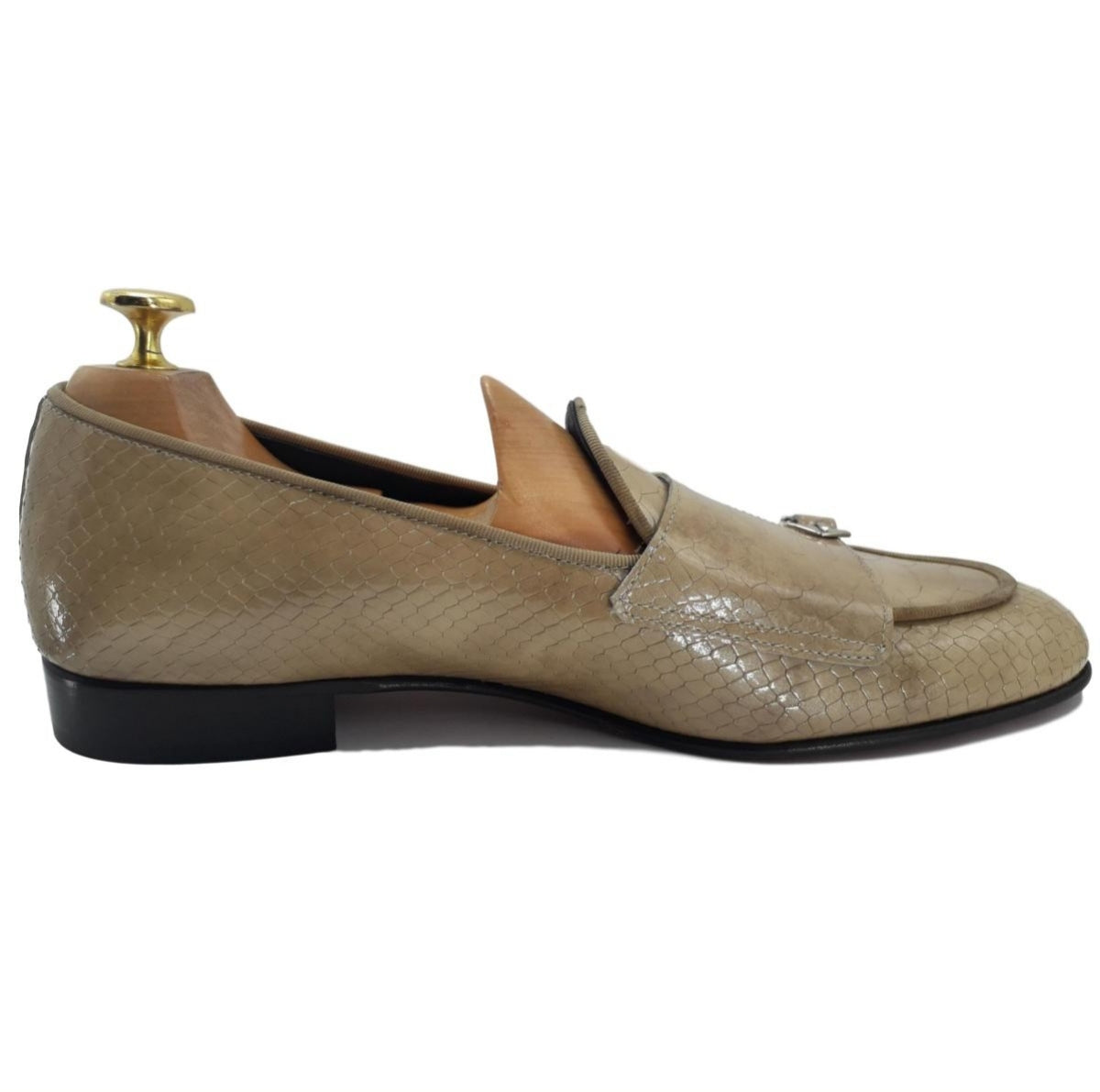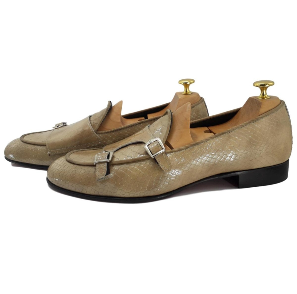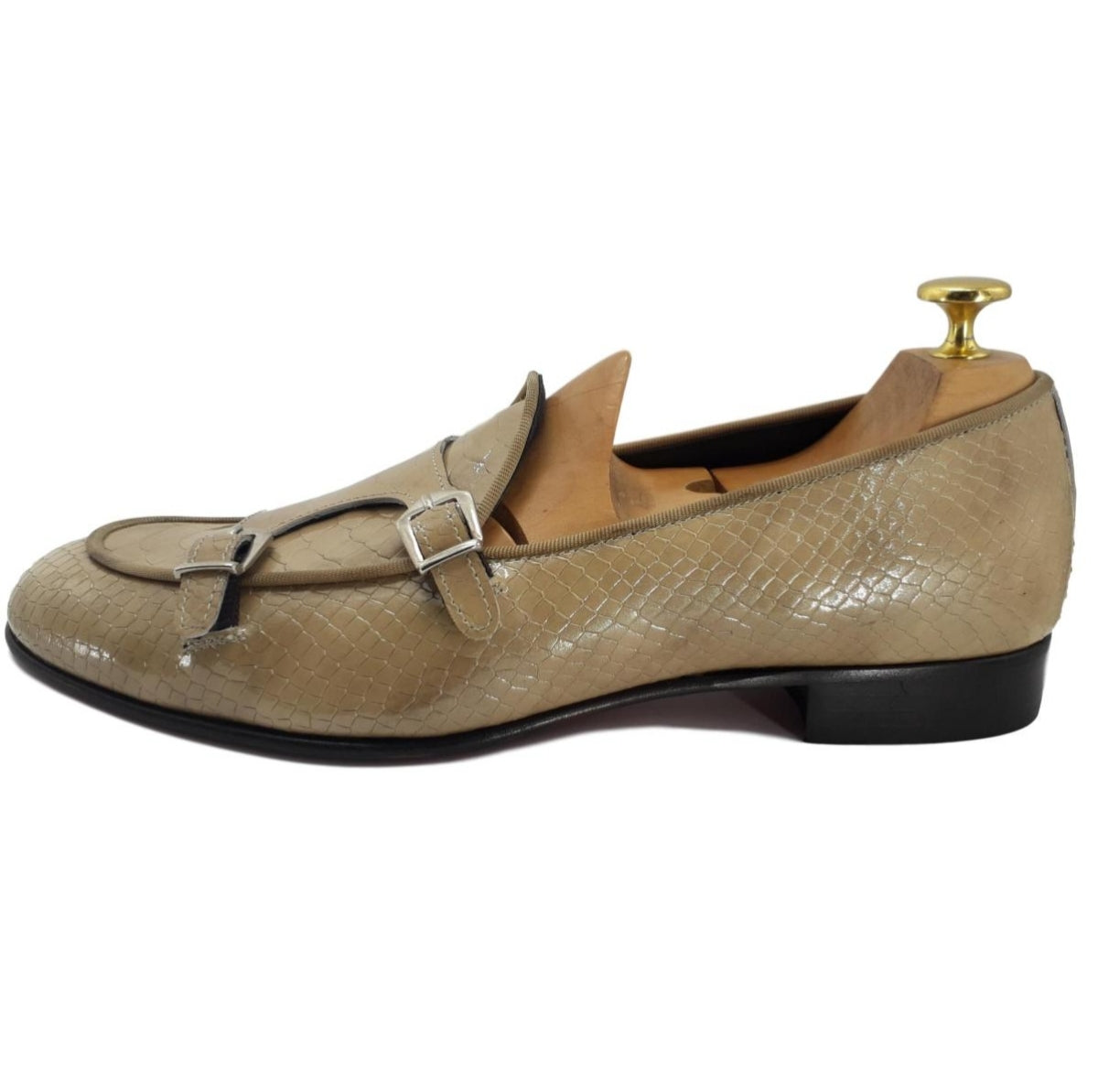 Confectionné en cuir beige façon croco, il présente une double boucle sophistiqué et une semelle cousue Blake pour une durabilité optimale.