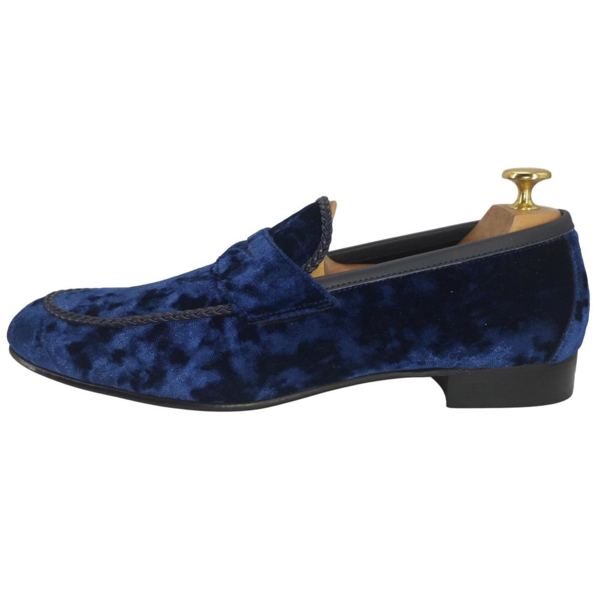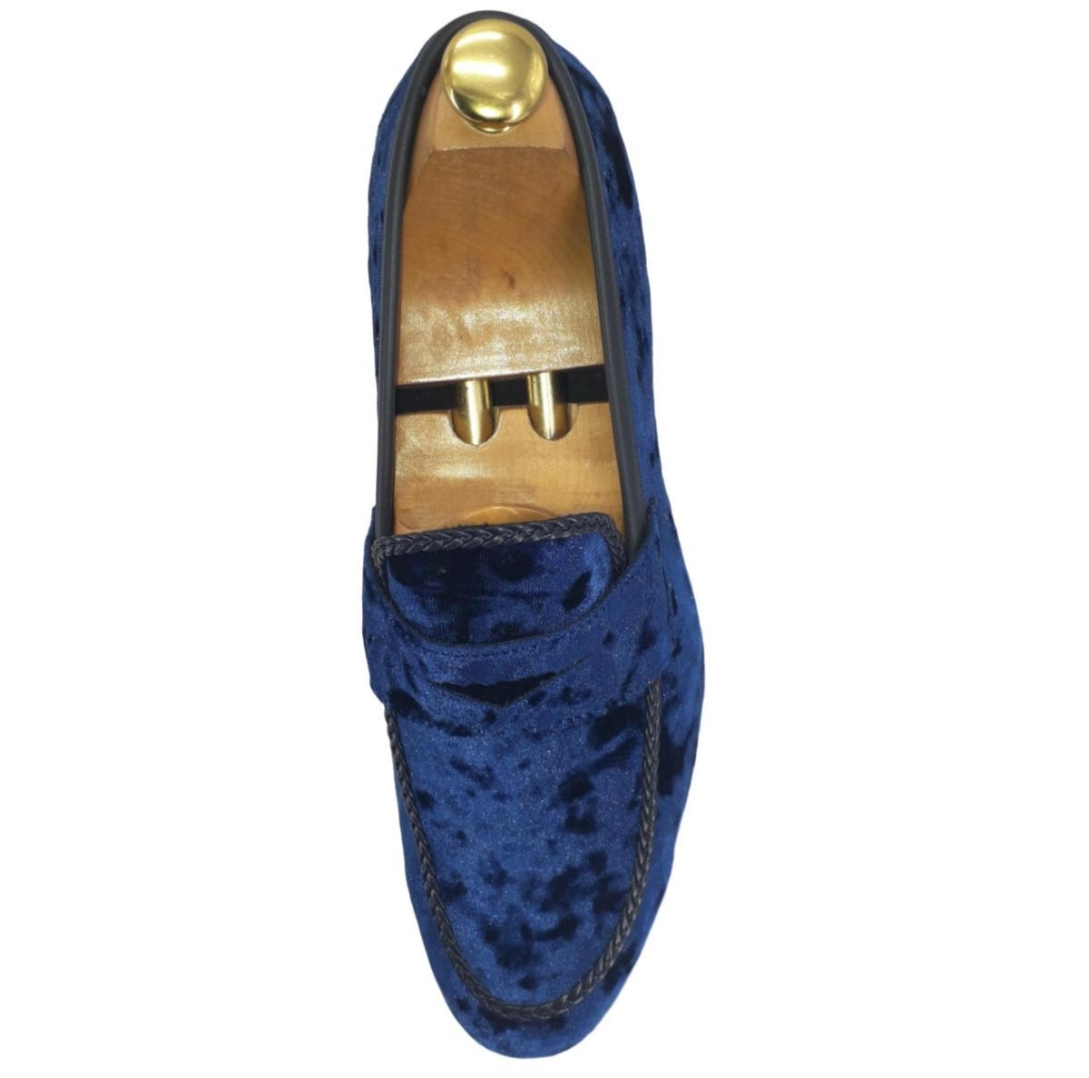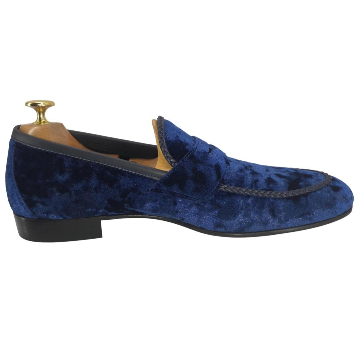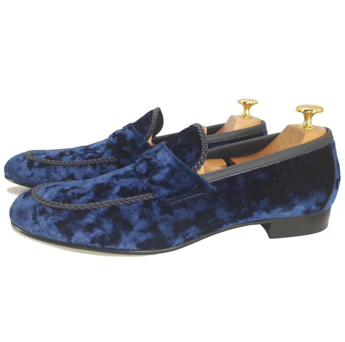 Son dessus en velours bleu souple, rehaussé de contours en cuir bleu, offre une élégance moderne et raffinée.