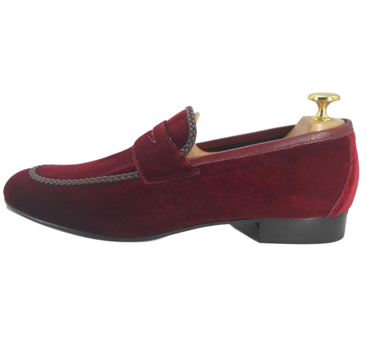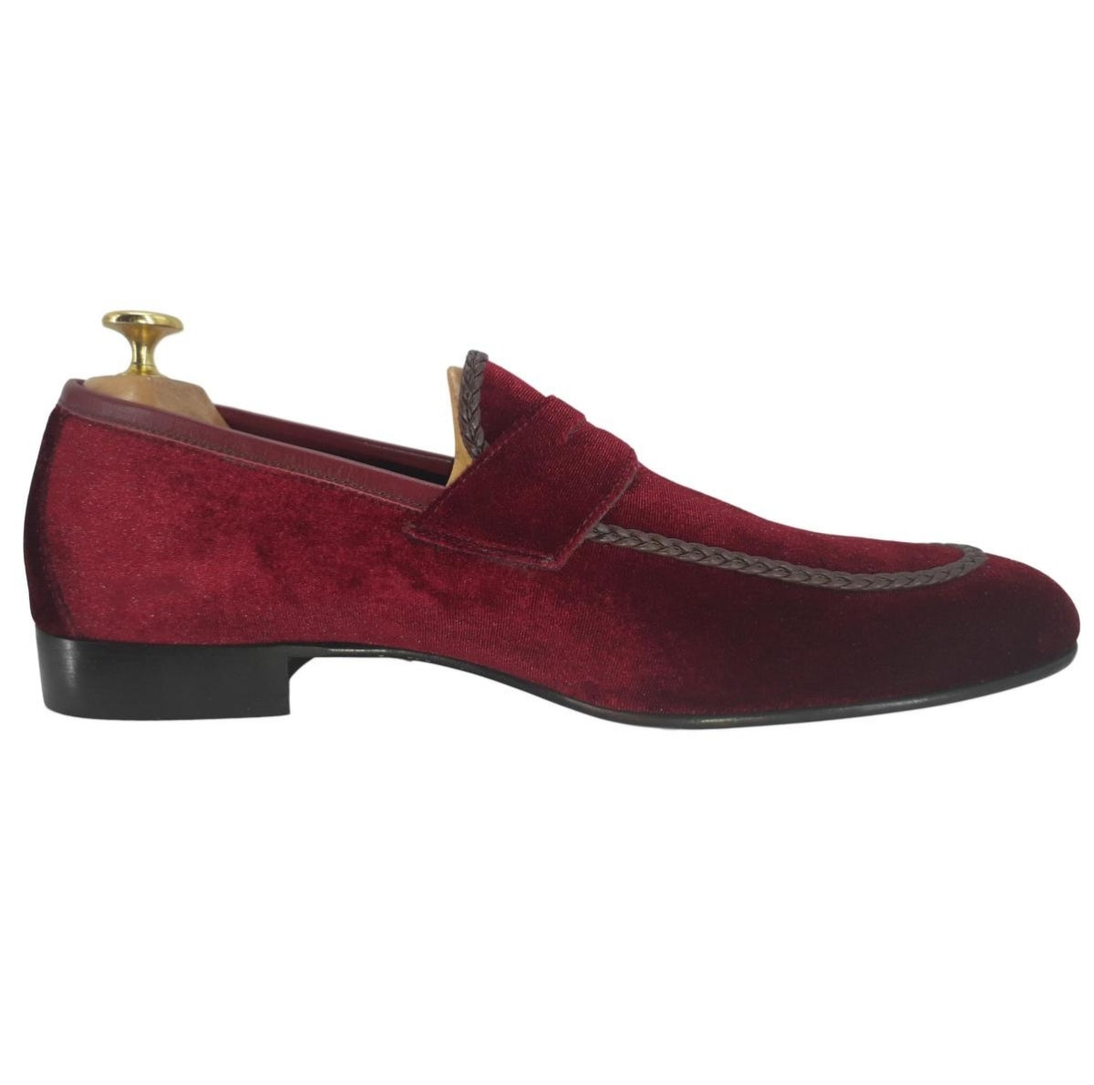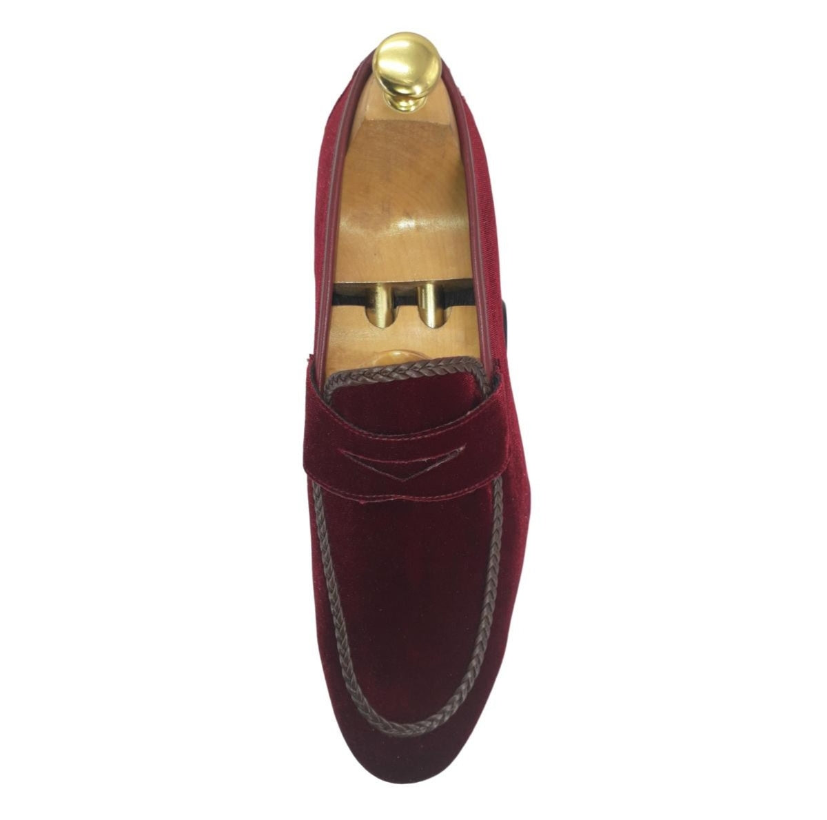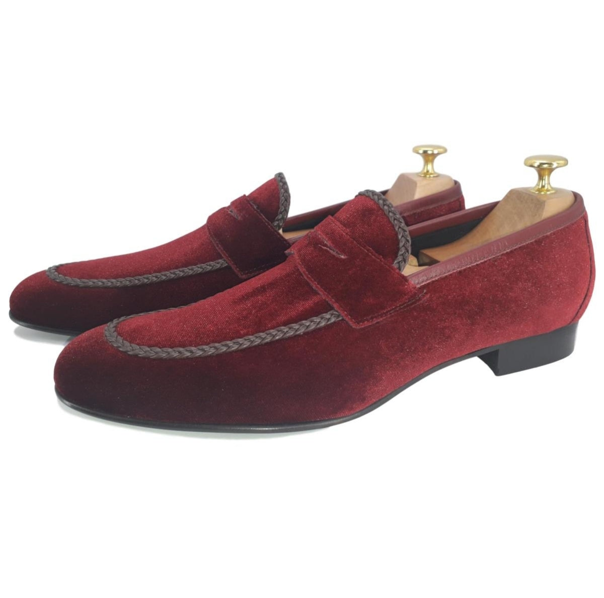 Son dessus en velours bordeaux doux est rehaussé de contours en cuir tressé bordeaux à l’avant et marron à l’arrière, offrant une élégance contemporaine.