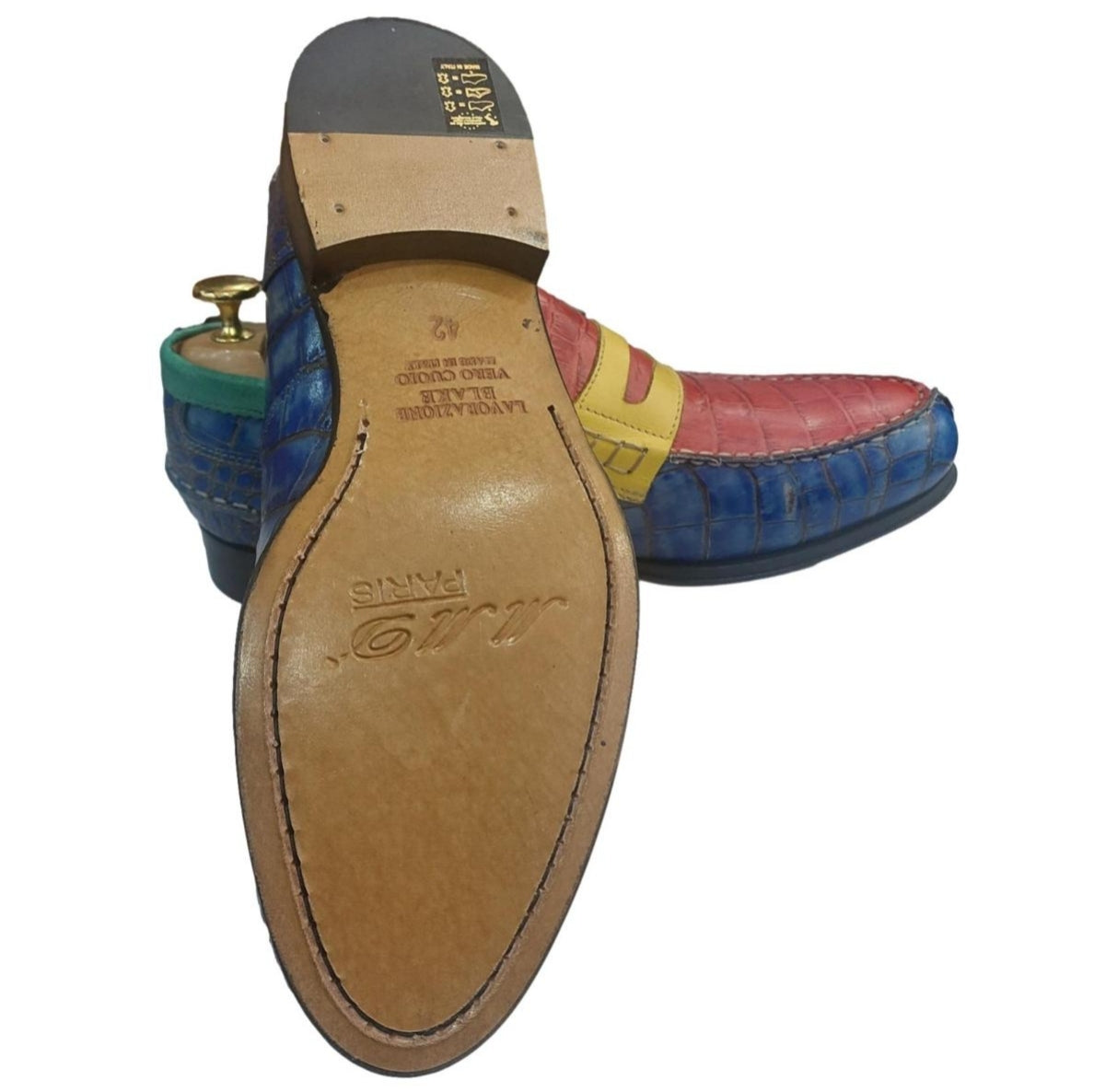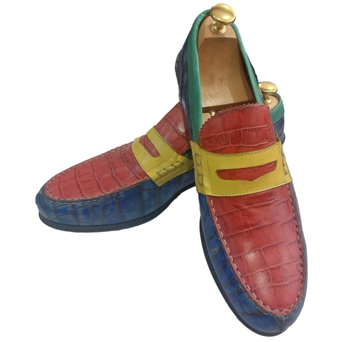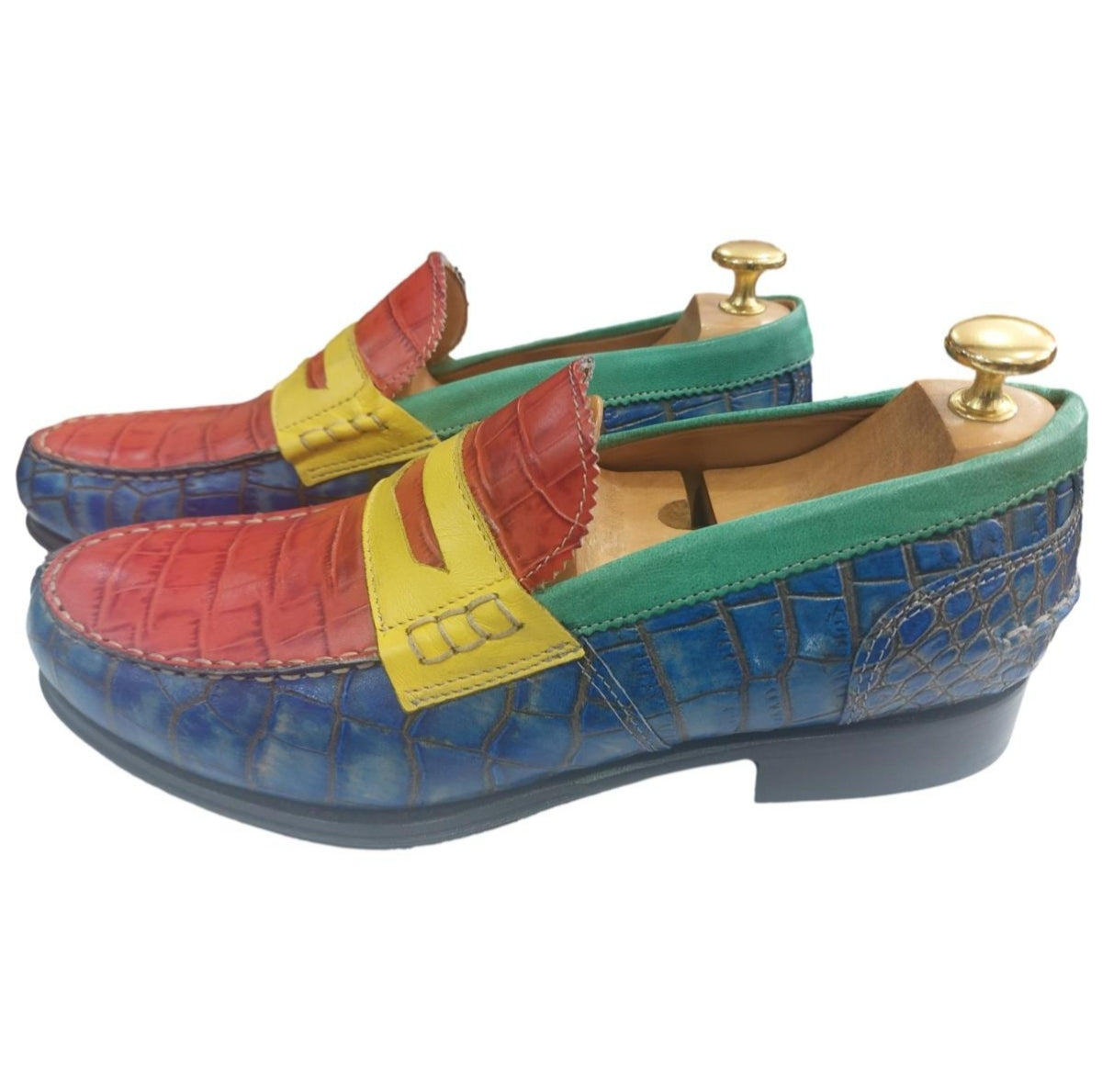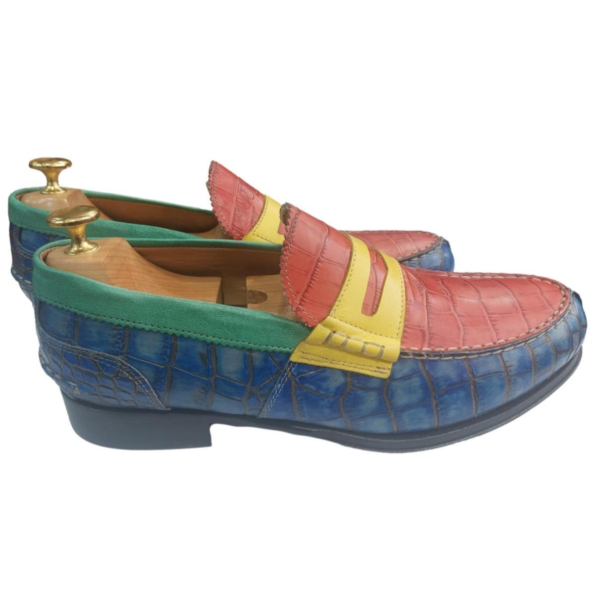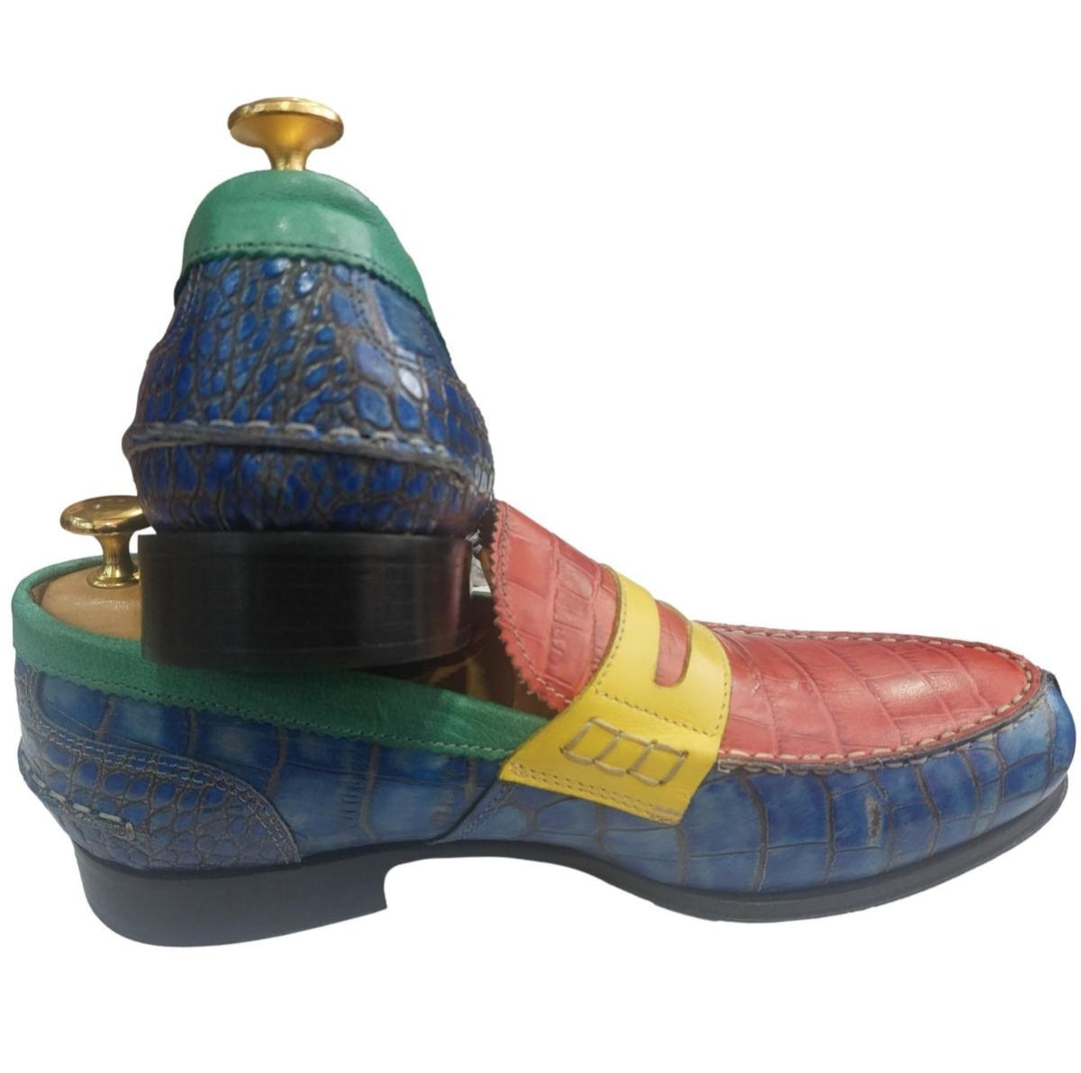 Ce mocassin multicolore allie l’excellence artisanale italienne à un design audacieux.